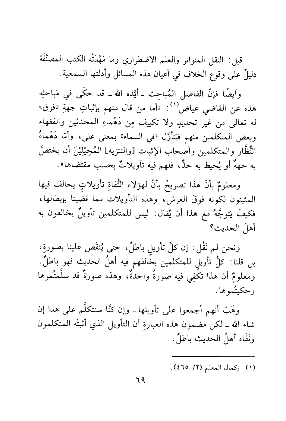 وأيضًا فإنّ الفاضل المُباحِث -أيَّده الله- قد حكَى في مَباحثِه هذه عن القاضي عياض (1): "أما من قال منهم بإثباتِ جهةِ "فوق" له تعالى من غير تحديدٍ ولا تكييف مِن دَهْماءِ المحدثين والفقهاء وبعض المتكلمين منهم فيَتأوَّل "في السماء" بمعنى على، وأما دَهْماءُ النُّظَّار والمتكلمين وأصحاب الإثبات [والتنزيه] المُحِيْلِيْنَ أن يختصَّ به جهة أو يُحيط به حدٌّ، فلهم فيه تأويلات بحسب مقتضاها".