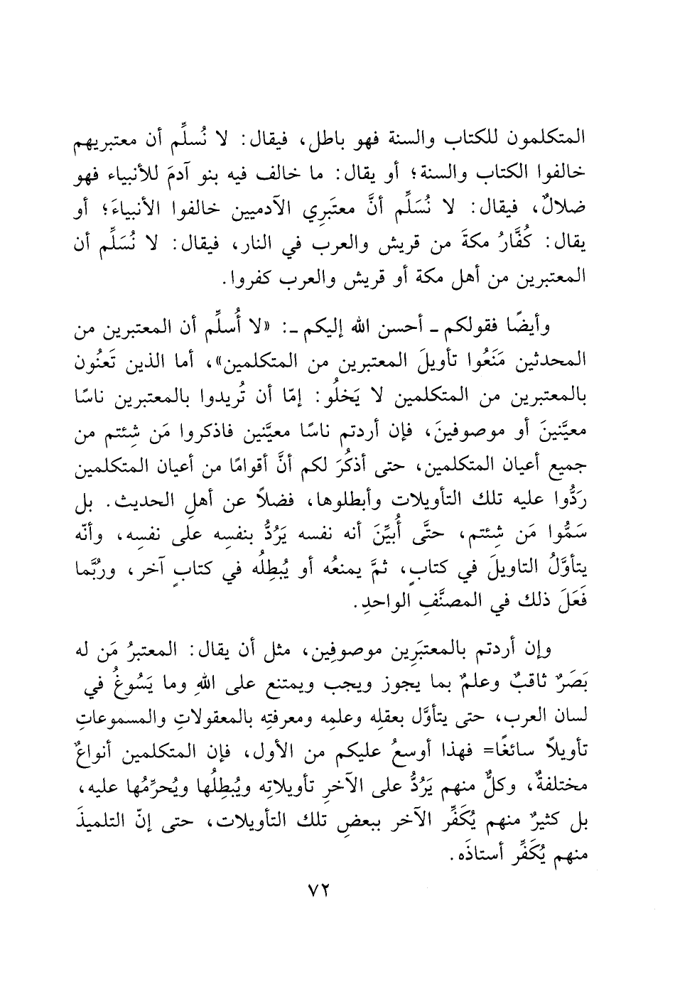 وأيضًا فقولكم -أحسن الله إليكم-: "لا أُسلِّم أن المعتبرين من المحدثين مَنَعُوا تأويلَ المعتبرين من المتكلمين"، أما الذين تَعنُون بالمعتبرين من المتكلمين لا يَخلُو: إمّا أن تُريدوا بالمعتبرين ناسًا معيَّنينَ أو موصوفينَ، فإن أردتم ناسًا معيَّنين فاذكروا مَن شِئتم من جميع أعيان المتكلمين، حتى أذكُرَ لكم أنَّ أقوامًا من أعيان المتكلمين رَدُّوا عليه تلك التأويلات وأبطلوها، فضلاً عن أهلِ الحديث. بل سَمُّوا مَن شِئتم، حتَّى أُبيِّنَ أنه نفسه يَرُدُّ بنفسِه على نفسِه، وأنّه يتأوَّلُ التأويلَ في كتابٍ، ثمَّ يمنعُه أو يُبطِلُه في كتابٍ آخر، وربما فَعَلَ ذلك في المصنَّفِ الواحدِ.