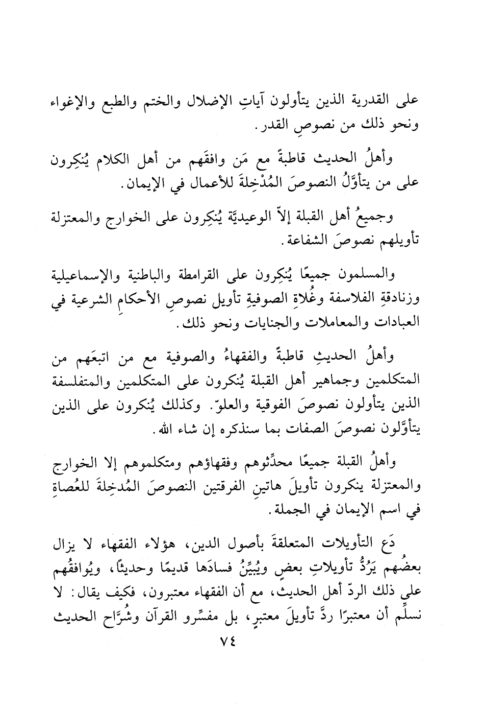 وأهلُ القبلة جميعًا محدِّثوهم وفقهاؤهم ومتكلموهم إلا الخوارج والمعتزلة ينكرون تأويلَ هاتينِ الفرقتين النصوصَ المُدخِلةَ للعُصاةِ في اسم الإيمان في الجملة.