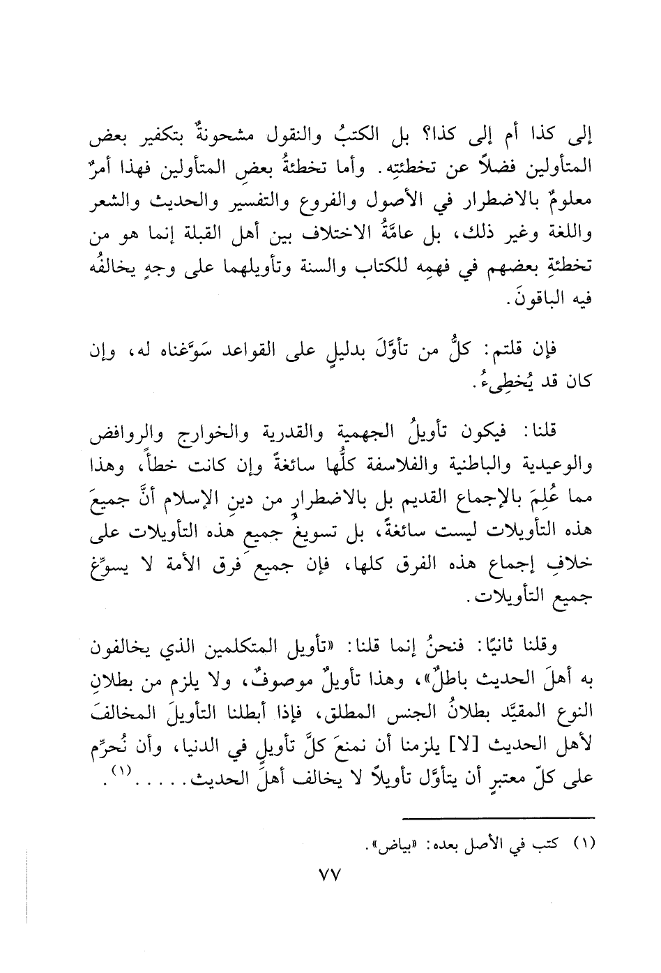 به أهلَ الحديث باطل"، وهذا تأويل موصوف، ولا يلزم من بطلانِ النوع المقيَّد بطلانُ الجنس المطلق، فإذا أبطلنا التأويلَ المخالفَ لأهل الحديث [لا] يلزمنا أن نمنعَ كلَّ تأويلٍ في الدنيا، وأن نُحرِّم على كلّ معتبرٍ أن يتأوَّل تأويلاً لا يخالف أهلَ الحديث…… (1).