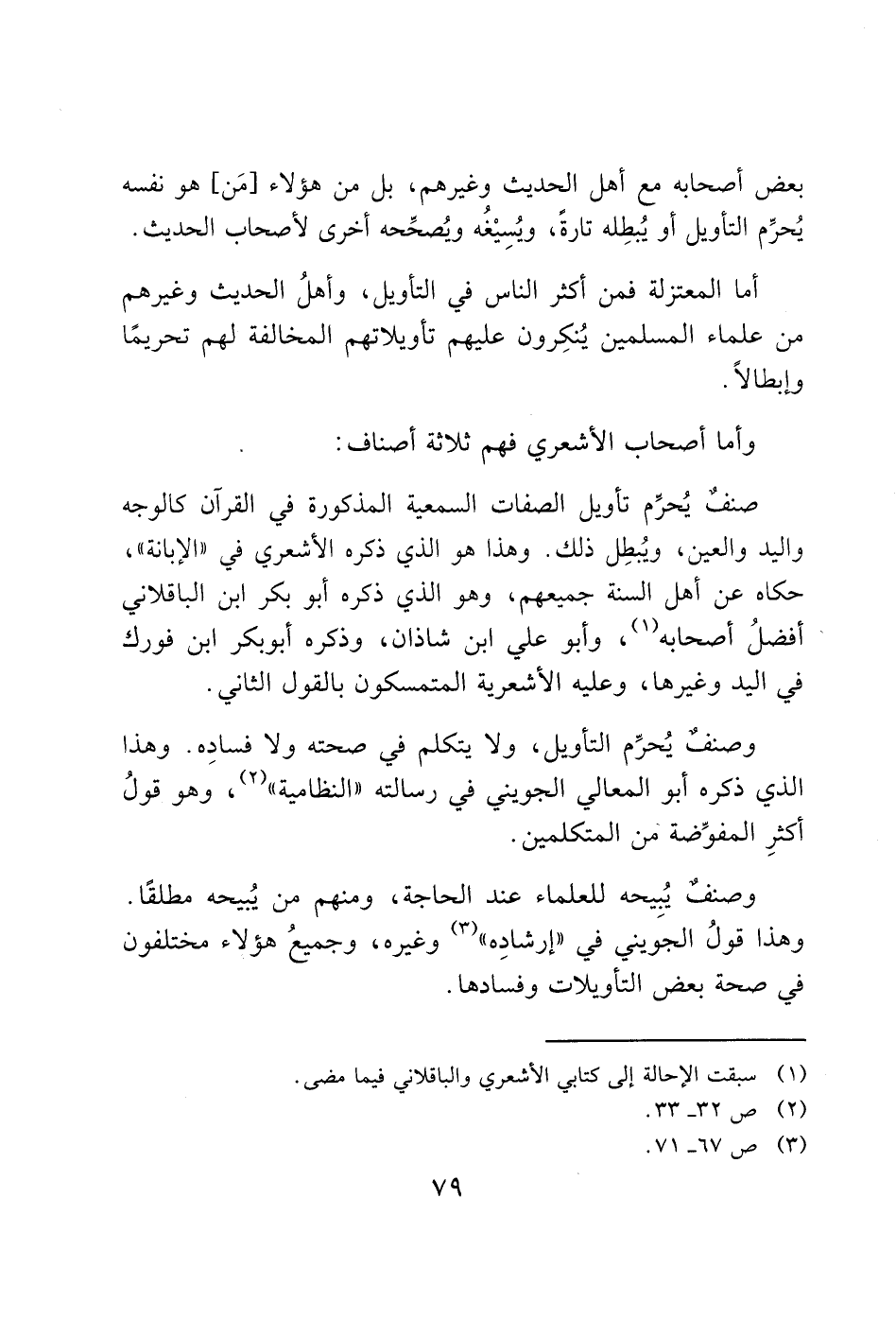 صنف يُحرم تأويل الصفات السمعية المذكورة في القرآن كالوجه واليد والعين، ويُبطِل ذلك. وهذا هو الذي ذكره الأشعري في "الإبانة"، حكاه عن أهل السنة جميعهم، وهو الذي ذكره أبو بكر ابن الباقلاني أفضلُ أصحابه (1)، وأبو علي ابن شاذان، وذكره أبو بكر ابن فورك في اليد وغيرها، وعليه الأشعرية المتمسكون بالقول الثاني.