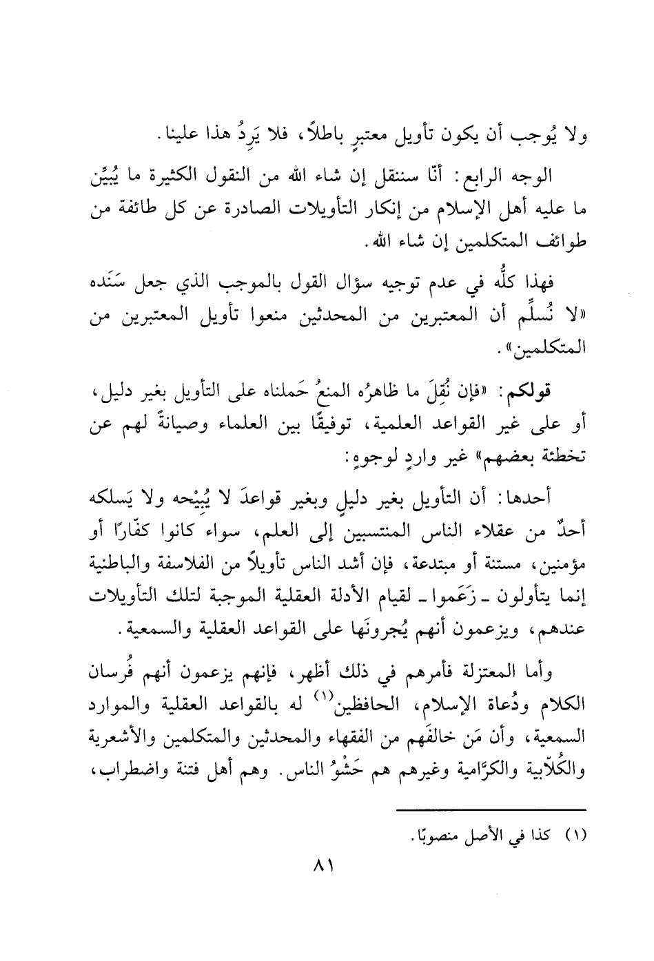 الوجه الرابع: أنّا سننقل إن شاء الله من النقول الكثيرة ما يُبيِّن ما عليه أهل الإسلام من إنكار التأويلات الصادرة عن كل طائفة من طوائف المتكلمين إن شاء الله.