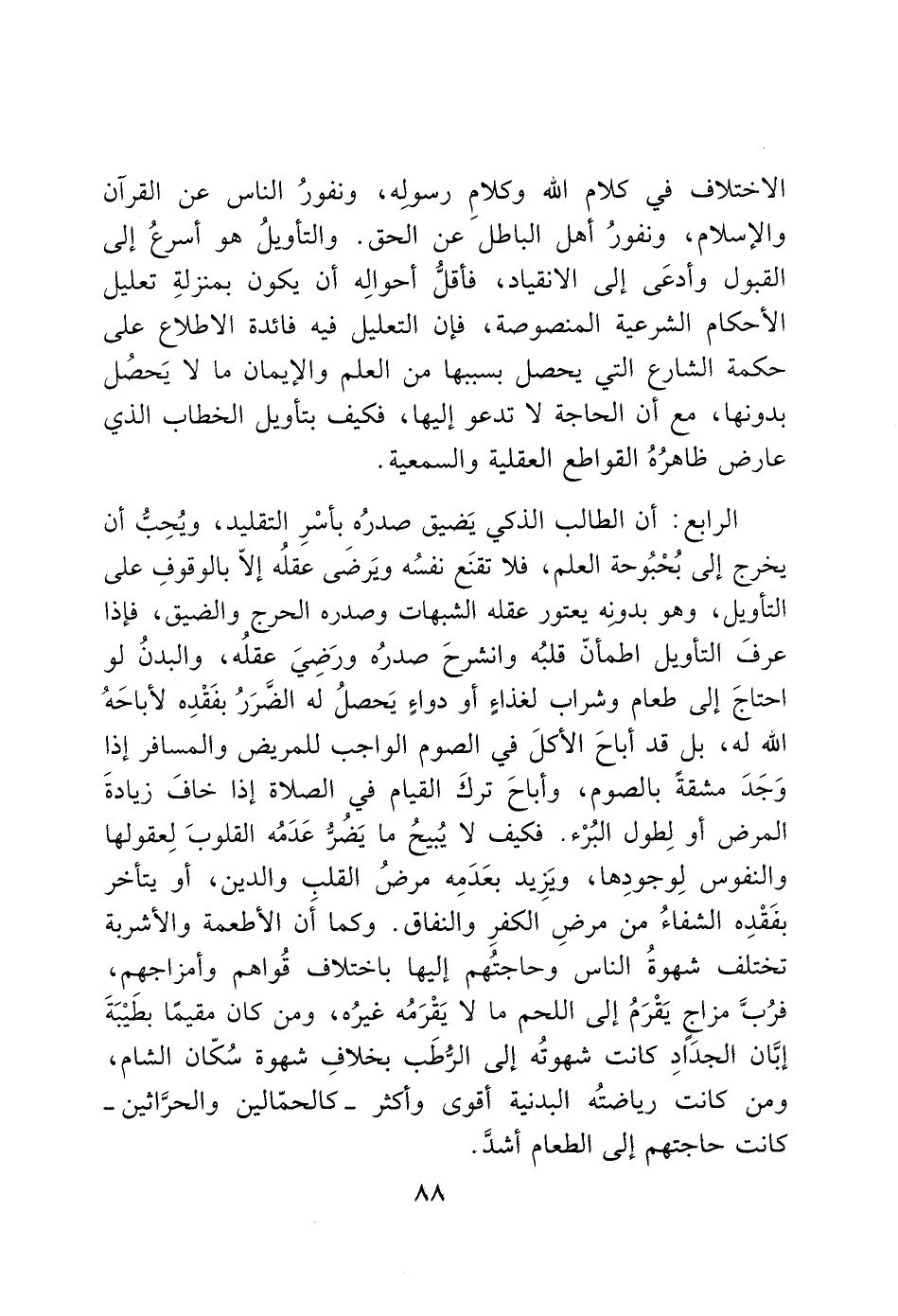 الرابع: أن الطالب الذكي يَضيق صدرُه بأسْرِ التقليد، ويُحِبُّ أن يخرج إلى بُحْبُوحة العلم، فلا تقنَع نفسُه ويَرضَى عقلُه إلاّ بالوقوفِ على التأويل، وهو بدونه يعتور عقله الشبهات وصدره الحرج والضيق، فإذا عرفَ التأويل اطمأنّ قلبُه وانشرحَ صدرُه ورَضِيَ عقلُه، والبدنُ لو احتاجَ إلى طعام وشراب لغذاءٍ أو دواءٍ يَحصلُ له الضَّرَرُ بفَقدِه لأباحَهُ الله له، بل قد أباحَ الأكلَ في الصوم الواجب للمريض والمسافر إذا وَجَدَ مشقةً بالصوم، وأباحَ تركَ القيام في الصلاة إذا خافَ زيادةَ المرض أو لِطول البُرْء. فكيف لا يُبيحُ ما يَضرُّ عَدَمُه القلوبَ لِعقولها والنفوس لِوجودِها، ويَزِيد بعَدَمِه مرضُ القلب والدين، أو يتأخر بفَقْدِه الشفاءُ من مرضِ الكفرِ والنفاق. وكما أَن الأطعمة والأشربة تختلف شهوةُ الناس وحاجتُهم إليها باختلاف قُواهم وأمزاجهم، فرُبَّ مزاج يَقْرَمُ إلى اللحم ما لا يَقْرَمُه غيرُه، ومن كان مقيمًا بطَيْبَةَ إبَّان الجدادِ كانت شهوتُه إلى الرُّطَب بخلافِ شهوة سُكّان الشام، ومن كانت رياضتُه البدنية أقوى وأكثر -كالحمّالين والحرَّاثين- كانت حاجتهم إلى الطعام أشدَّ.