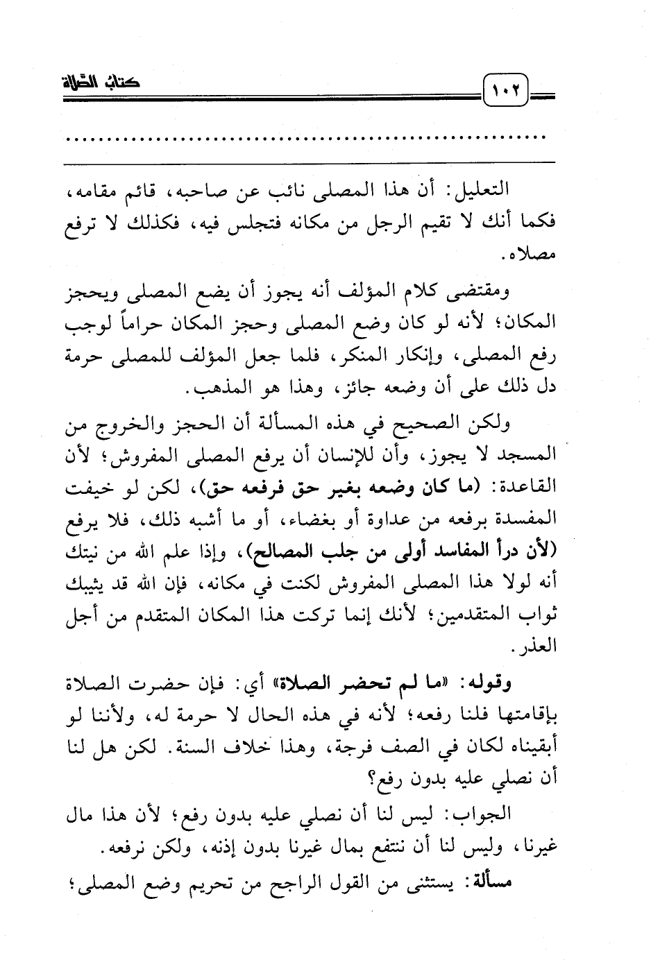 ولكن الصحيح في هذه المسألة أن الحجز والخروج من المسجد لا يجوز، وأن للإنسان أن يرفع المصلى المفروش؛ لأن القاعدة: (ما كان وضعه بغير حق فرفعه حق)، لكن لو خيفت المفسدة برفعه من عداوة أو بغضاء، أو ما أشبه ذلك، فلا يرفع (لأن درأ المفاسد أولى من جلب المصالح)، وإذا علم الله من نيتك أنه لولا هذا المصلى المفروش لكنت في مكانه، فإن الله قد يثيبك ثواب المتقدمين؛ لأنك إنما تركت هذا المكان المتقدم من أجل العذر.