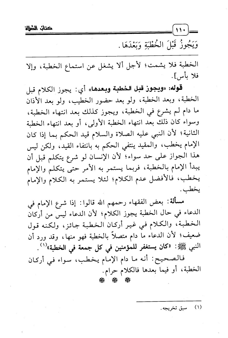 مسألة: بعض الفقهاء رحمهم الله قالوا: إذا شرع الإمام في الدعاء في حال الخطبة يجوز الكلام؛ لأن الدعاء ليس من أركان الخطبة، والكلام في غير أركان الخطبة جائز، ولكنه قول ضعيف؛ لأن الدعاء ما دام متصلاً بالخطبة فهو منها، وقد ورد أن النبي صلّى الله عليه وسلّم: «كان يستغفر للمؤمنين في كل جمعة في الخطبة» (¬1).