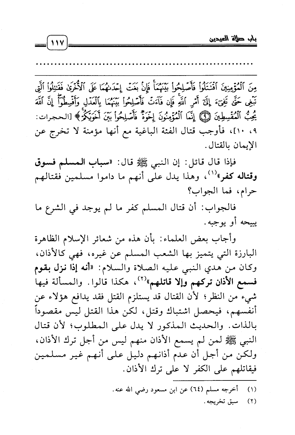 وأجاب بعض العلماء: بأن هذه من شعائر الإسلام الظاهرة البارزة التي يتميز بها الشعب المسلم عن غيره، فهي كالأذان، وكان من هدي النبي عليه الصلاة والسلام: «أنه إذا نزل بقوم فسمع الأذان تركهم وإلا قاتلهم» (¬2)، هكذا قالوا. والمسألة فيها شيء من النظر؛ لأن القتال قد يستلزم القتل فقد يدافع هؤلاء عن أنفسهم، فيحصل اشتباك وقتل، لكن هذا القتل ليس مقصوداً بالذات. والحديث المذكور لا يدل على المطلوب؛ لأن قتال النبي صلّى الله عليه وسلّم لمن لم يسمع الأذان منهم ليس من أجل ترك الأذان، ولكن من أجل أن عدم أذانهم دليل على أنهم غير مسلمين فيقاتلهم على الكفر لا على ترك الأذان.