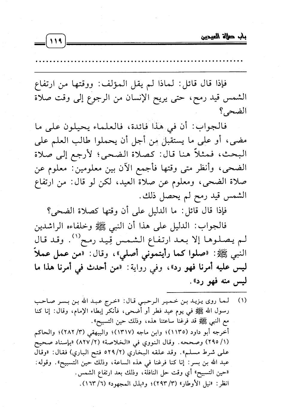 فالجواب: الدليل على هذا أن النبي صلّى الله عليه وسلّم وخلفاءه الراشدين لم يصلوها إلا بعد ارتفاع الشمس قِيد رمح (¬1). وقد قال النبي صلّى الله عليه وسلّم: «صلوا كما رأيتموني أصلي»، وقال: «من عمل عملاً ليس عليه أمرنا فهو رد»، وفي رواية: «من أحدث في أمرنا هذا ما ليس منه فهو رد».