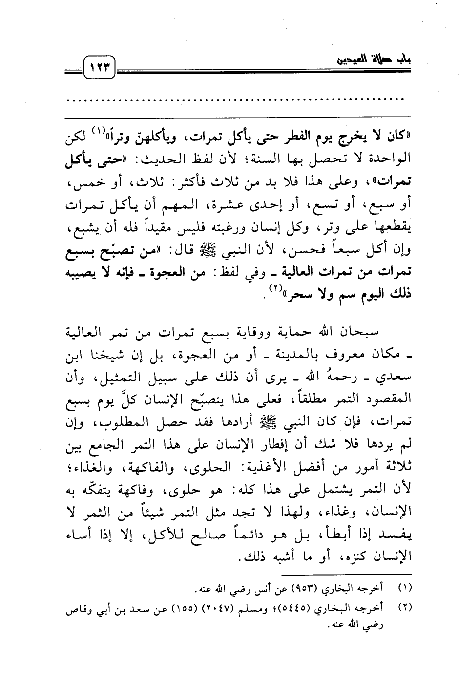 «كان لا يخرج يوم الفطر حتى يأكل تمرات، ويأكلهنّ وتراً» (¬1) لكن الواحدة لا تحصل بها السنة؛ لأن لفظ الحديث: «حتى يأكل تمرات»، وعلى هذا فلا بد من ثلاث فأكثر: ثلاث، أو خمس، أو سبع، أو تسع، أو إحدى عشرة، المهم أن يأكل تمرات يقطعها على وتر، وكل إنسان ورغبته فليس مقيداً فله أن يشبع، وإن أكل سبعاً فحسن، لأن النبي صلّى الله عليه وسلّم قال: «من تصبّح بسبع تمرات من تمرات العالية ـ وفي لفظ: من العجوة ـ فإنه لا يصيبه ذلك اليوم سم ولا سحر» (¬2).