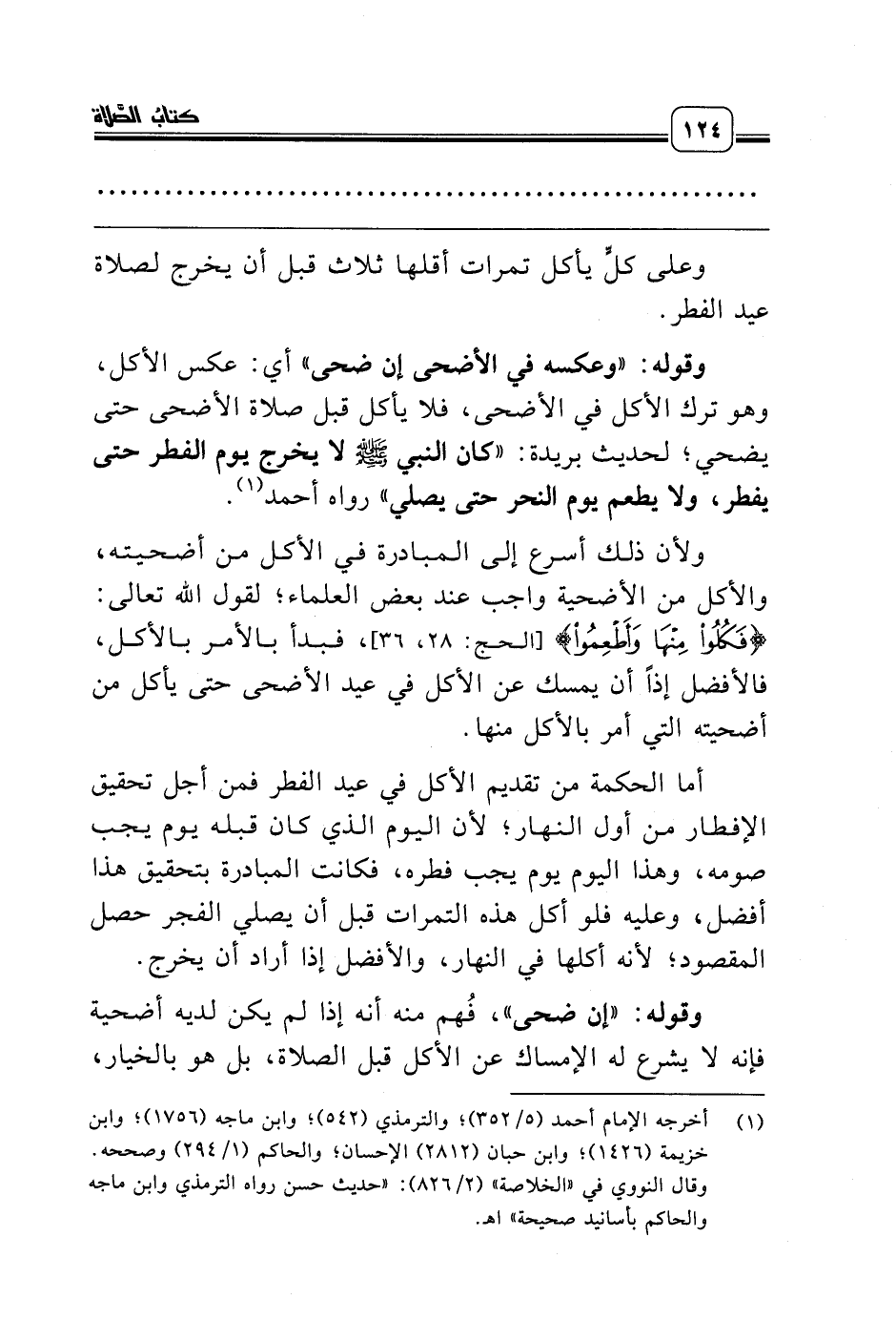 وقوله: «وعكسه في الأضحى إن ضحى» أي: عكس الأكل، وهو ترك الأكل في الأضحى، فلا يأكل قبل صلاة الأضحى حتى يضحي؛ لحديث بريدة: «كان النبي صلّى الله عليه وسلّم لا يخرج يوم الفطر حتى يفطر، ولا يطعم يوم النحر حتى يصلي» رواه أحمد (¬1).