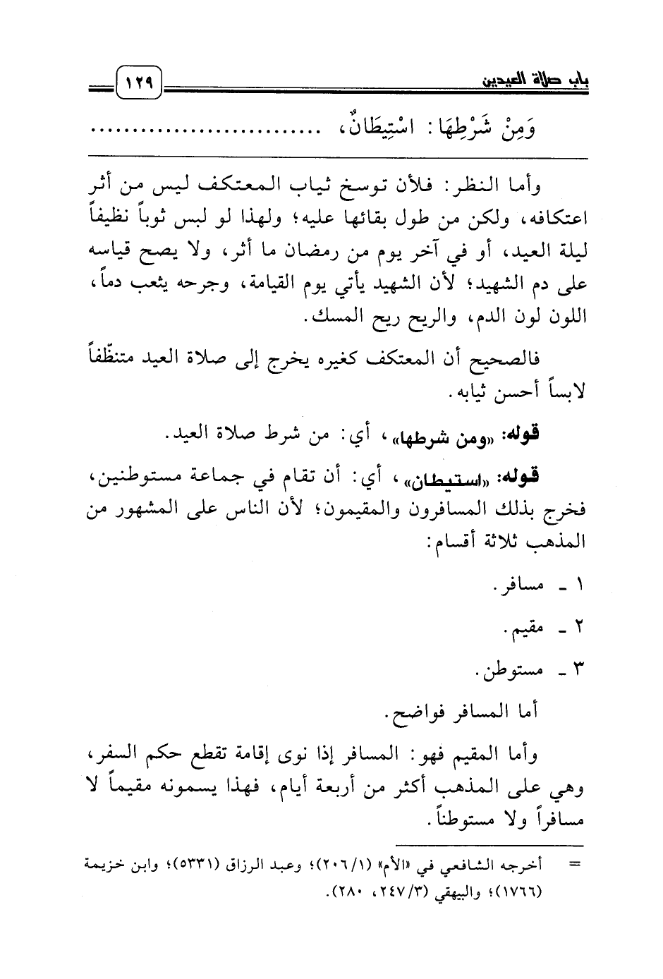 وأما المقيم فهو: المسافر إذا نوى إقامة تقطع حكم السفر، وهي على المذهب أكثر من أربعة أيام، فهذا يسمونه مقيماً لا مسافراً ولا مستوطناً.
