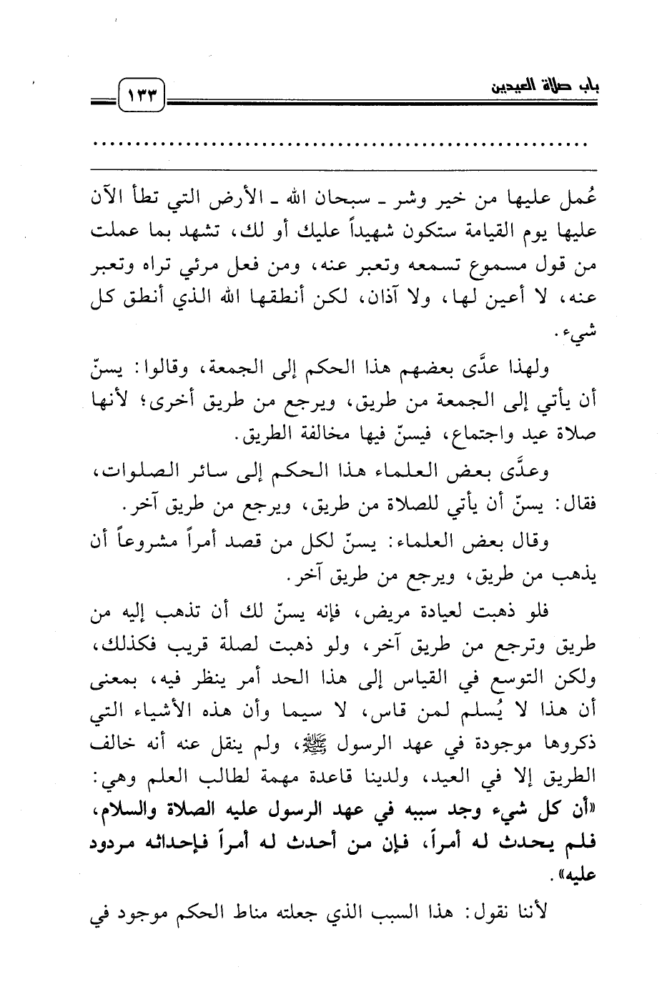 فلو ذهبت لعيادة مريض، فإنه يسنّ لك أن تذهب إليه من طريق وترجع من طريق آخر، ولو ذهبت لصلة قريب فكذلك، ولكن التوسع في القياس إلى هذا الحد أمر ينظر فيه، بمعنى أن هذا لا يُسلم لمن قاس، لا سيما وأن هذه الأشياء التي ذكروها موجودة في عهد الرسول صلّى الله عليه وسلّم، ولم ينقل عنه أنه خالف الطريق إلا في العيد، ولدينا قاعدة مهمة لطالب العلم وهي: «أن كل شيء وجد سببه في عهد الرسول عليه الصلاة والسلام، فلم يحدث له أمراً، فإن من أحدث له أمراً فإحداثه مردود عليه».