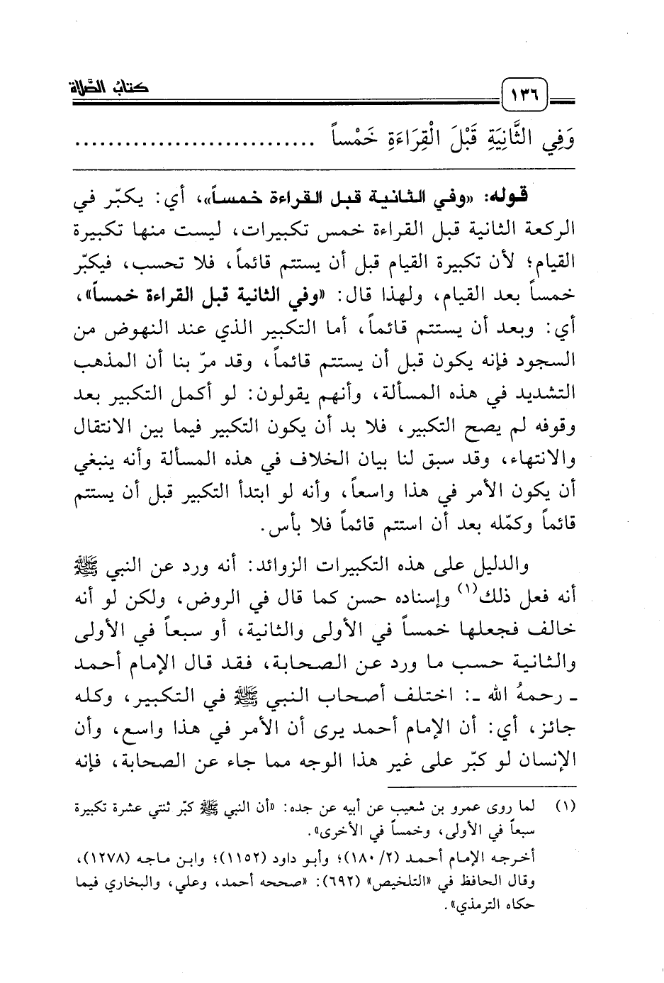 قوله: «وفي الثانية قبل القراءة خمساً»، أي: يكبّر في الركعة الثانية قبل القراءة خمس تكبيرات، ليست منها تكبيرة القيام؛ لأن تكبيرة القيام قبل أن يستتم قائماً، فلا تحسب، فيكبّر خمساً بعد القيام، ولهذا قال: «وفي الثانية قبل القراءة خمساً»، أي: وبعد أن يستتم قائماً، أما التكبير الذي عند النهوض من السجود فإنه يكون قبل أن يستتم قائماً، وقد مرّ بنا أن المذهب التشديد في هذه المسألة، وأنهم يقولون: لو أكمل التكبير بعد وقوفه لم يصح التكبير، فلا بد أن يكون التكبير فيما بين الانتقال والانتهاء، وقد سبق لنا بيان الخلاف في هذه المسألة وأنه ينبغي أن يكون الأمر في هذا واسعاً، وأنه لو ابتدأ التكبير قبل أن يستتم قائماً وكمّله بعد أن استتم قائماً فلا بأس.