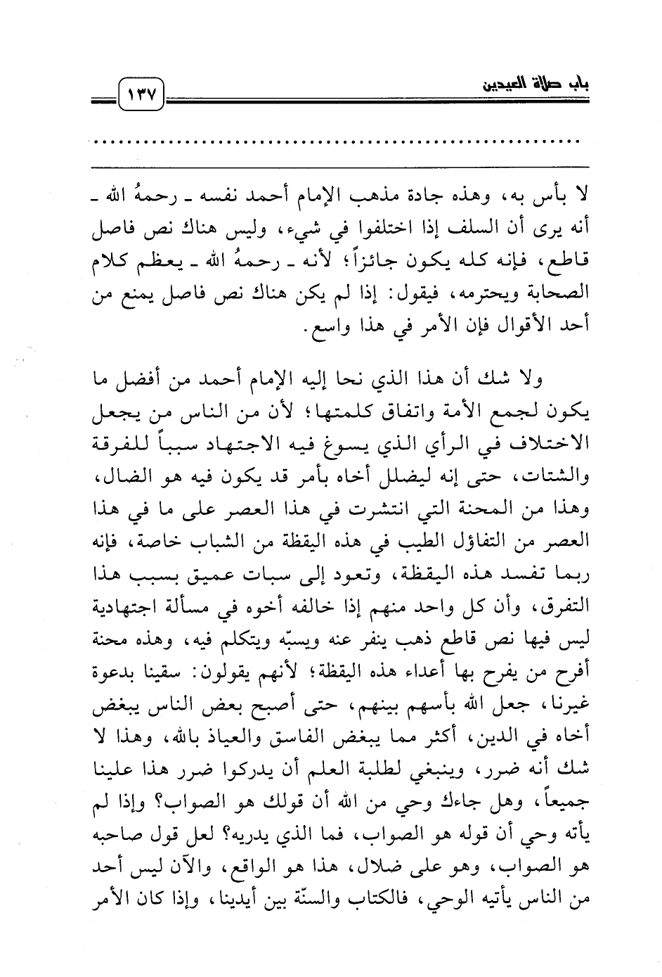 ولا شك أن هذا الذي نحا إليه الإمام أحمد من أفضل ما يكون لجمع الأمة واتفاق كلمتها؛ لأن من الناس من يجعل الاختلاف في الرأي الذي يسوغ فيه الاجتهاد سبباً للفرقة والشتات، حتى إنه ليضلل أخاه بأمر قد يكون فيه هو الضال، وهذا من المحنة التي انتشرت في هذا العصر على ما في هذا العصر من التفاؤل الطيب في هذه اليقظة من الشباب خاصة، فإنه ربما تفسد هذه اليقظة، وتعود إلى سبات عميق بسبب هذا التفرق، وأن كل واحد منهم إذا خالفه أخوه في مسألة اجتهادية ليس فيها نص قاطع ذهب ينفر عنه ويسبّه ويتكلم فيه، وهذه محنة أفرح من يفرح بها أعداء هذه اليقظة؛ لأنهم يقولون: سقينا بدعوة غيرنا، جعل الله بأسهم بينهم، حتى أصبح بعض الناس يبغض أخاه في الدين، أكثر مما يبغض الفاسق والعياذ بالله، وهذا لا شك أنه ضرر، وينبغي لطلبة العلم أن يدركوا ضرر هذا علينا جميعاً، وهل جاءك وحي من الله أن قولك هو الصواب؟ وإذا لم يأته وحي أن قوله هو الصواب، فما الذي يدريه؟ لعل قول صاحبه هو الصواب، وهو على ضلال، هذا هو الواقع، والآن ليس أحد من الناس يأتيه الوحي، فالكتاب والسنّة بين أيدينا، وإذا كان الأمر
