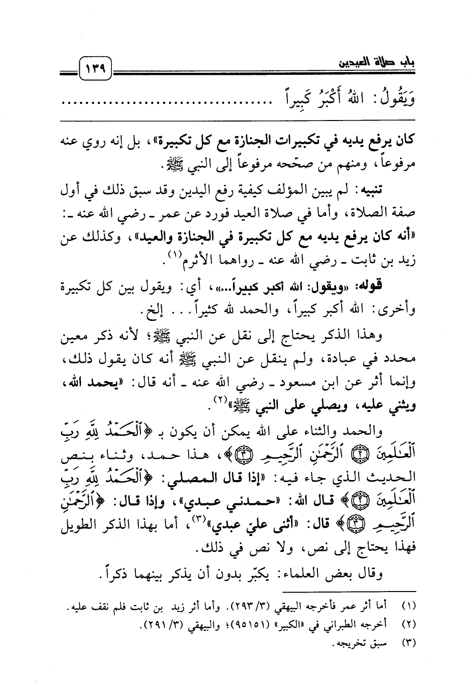 تنبيه: لم يبين المؤلف كيفية رفع اليدين وقد سبق ذلك في أول صفة الصلاة، وأما في صلاة العيد فورد عن عمر ـ رضي الله عنه ـ: «أنه كان يرفع يديه مع كل تكبيرة في الجنازة والعيد»، وكذلك عن زيد بن ثابت ـ رضي الله عنه ـ رواهما الأثرم (¬1).
