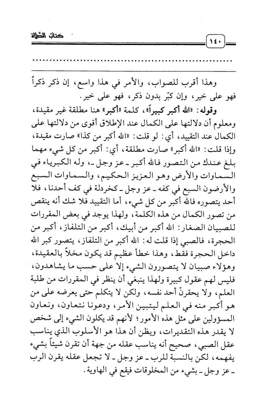 وقوله: «الله أكبر كبيراً»، كلمة «أكبر» هنا مطلقة غير مقيدة، ومعلوم أن دلالتها على الكمال عند الإطلاق أقوى من دلالتها على الكمال عند التقييد، أي: لو قلت: «الله أكبر من كذا» صارت مقيدة، وإذا قلت: «الله أكبر» صارت مطلقة، أي: أكبر من كل شيء مهما بلغ عندك من التصور فالله أكبر ـ عز وجل ـ، وله الكبرياء في السماوات والأرض وهو العزيز الحكيم، والسماوات السبع والأرضون السبع في كفه ـ عز وجل ـ كخردلة في كف أحدنا، فلا أحد يتصوره فالله أكبر من كل شيء، أما التقييد فلا شك أنه ينقص من تصور الكمال من هذه الكلمة، ولهذا يوجد في بعض المقررات للصبيان الصغار: الله أكبر من أبيك، أكبر من التلفاز، أكبر من الحجرة، فالصبي إذا قلت له: الله أكبر من التلفاز، يتصور كبر الله داخل الحجرة فقط، وهذا خطأ عظيم قد يكون مخلاً بالعقيدة، وهؤلاء صبيان لا يتصورون الشيء إلا على حسب ما يشاهدون، فليس لهم عقول كبيرة ولهذا ينبغي أن ينظر في المقررات من طلبة العلم، ولا يحقرنّ أحد نفسه، ولكن لا يتكلم حتى يعرضه على من هو أكبر منه في العلم ليتبين الأمر، ودعونا نتعاون، ونعاون المسؤولين على مثل هذه الأمور؛ لأنهم قد يكلون الشيء إلى شخص لا يقدر هذه التقديرات، ويظن أن هذا هو الأسلوب الذي يناسب عقل الصبي، صحيح أنه يناسب عقله من جهة أن تقرن شيئاً بشيء يفهمه، لكن بالنسبة للرب ـ عز وجل ـ لا تجعل عقله يقرن الرب ـ عز وجل ـ بشيء من المخلوقات فيقع في الهاوية.