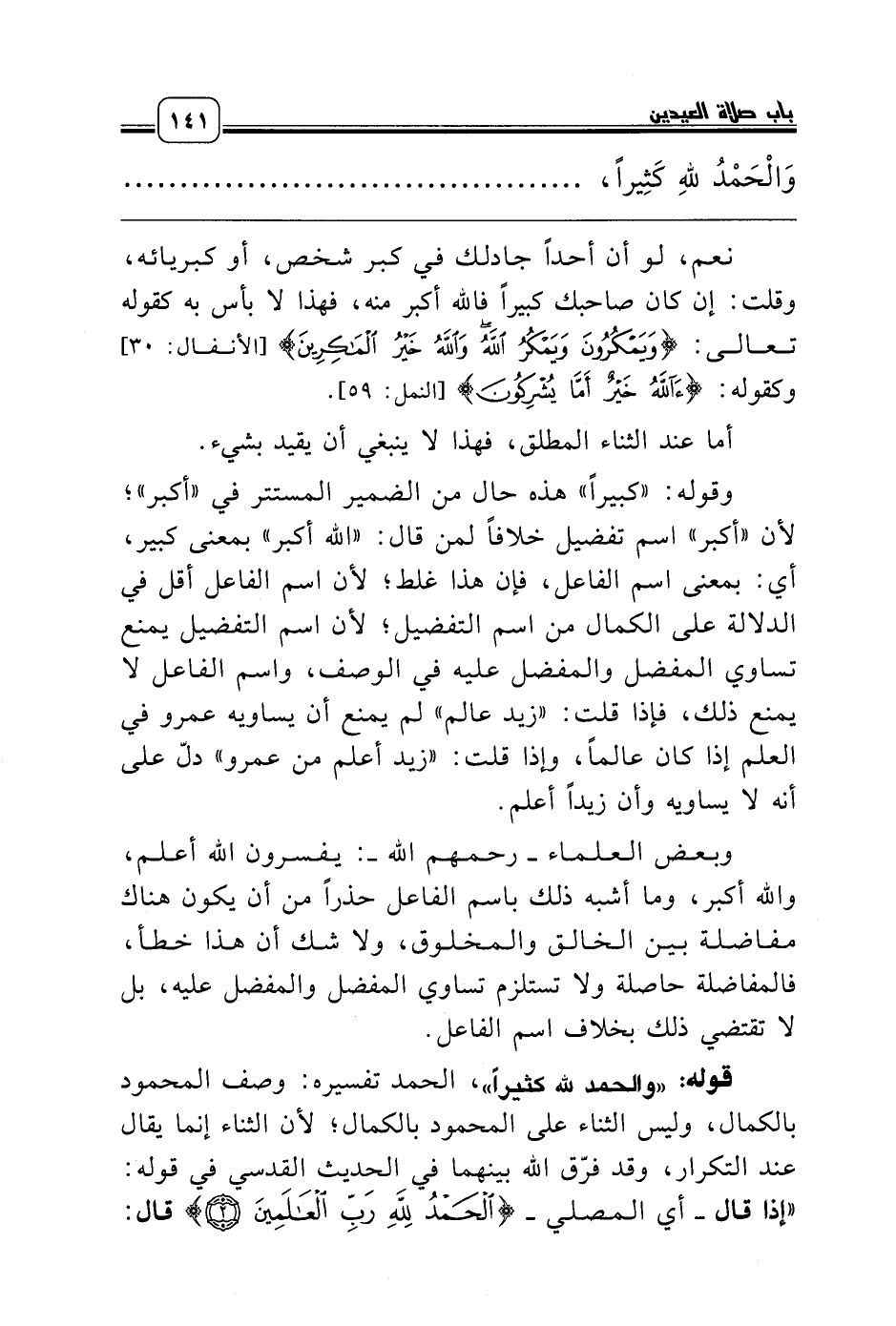 وقوله: «كبيراً» هذه حال من الضمير المستتر في «أكبر»؛ لأن «أكبر» اسم تفضيل خلافاً لمن قال: «الله أكبر» بمعنى كبير، أي: بمعنى اسم الفاعل، فإن هذا غلط؛ لأن اسم الفاعل أقل في الدلالة على الكمال من اسم التفضيل؛ لأن اسم التفضيل يمنع تساوي المفضل والمفضل عليه في الوصف، واسم الفاعل لا يمنع ذلك، فإذا قلت: «زيد عالم» لم يمنع أن يساويه عمرو في العلم إذا كان عالماً، وإذا قلت: «زيد أعلم من عمرو» دلّ على أنه لا يساويه وأن زيداً أعلم.
