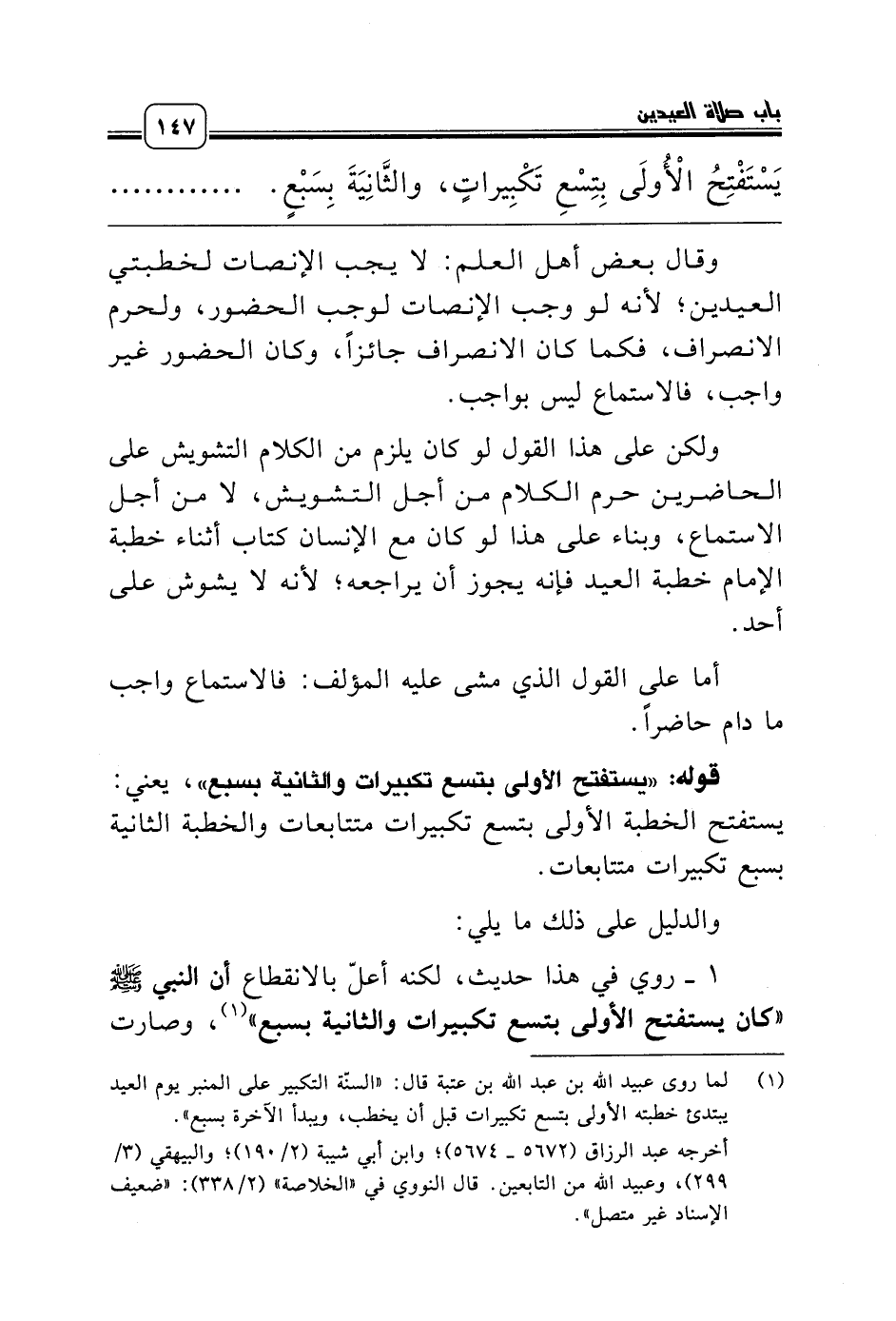 (¬1) لما روى عبيد الله بن عبد الله بن عتبة قال: «السنّة التكبير على المنبر يوم العيد يبتدئ خطبته الأولى بتسع تكبيرات قبل أن يخطب، ويبدأ الآخرة بسبع».