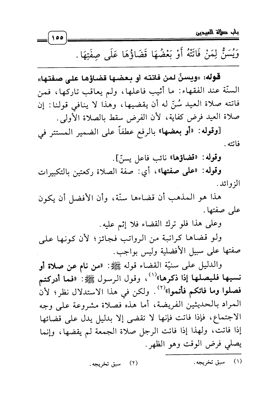 قوله: «ويسنّ لمن فاتته أو بعضها قضاؤها على صفتها» السنّة عند الفقهاء: ما أثيب فاعلها، ولم يعاقب تاركها، فمن فاتته صلاة العيد سُنّ له أن يقضيها، وهذا لا ينافي قولنا: إن صلاة العيد فرض كفاية، لأن الفرض سقط بالصلاة الأولى.