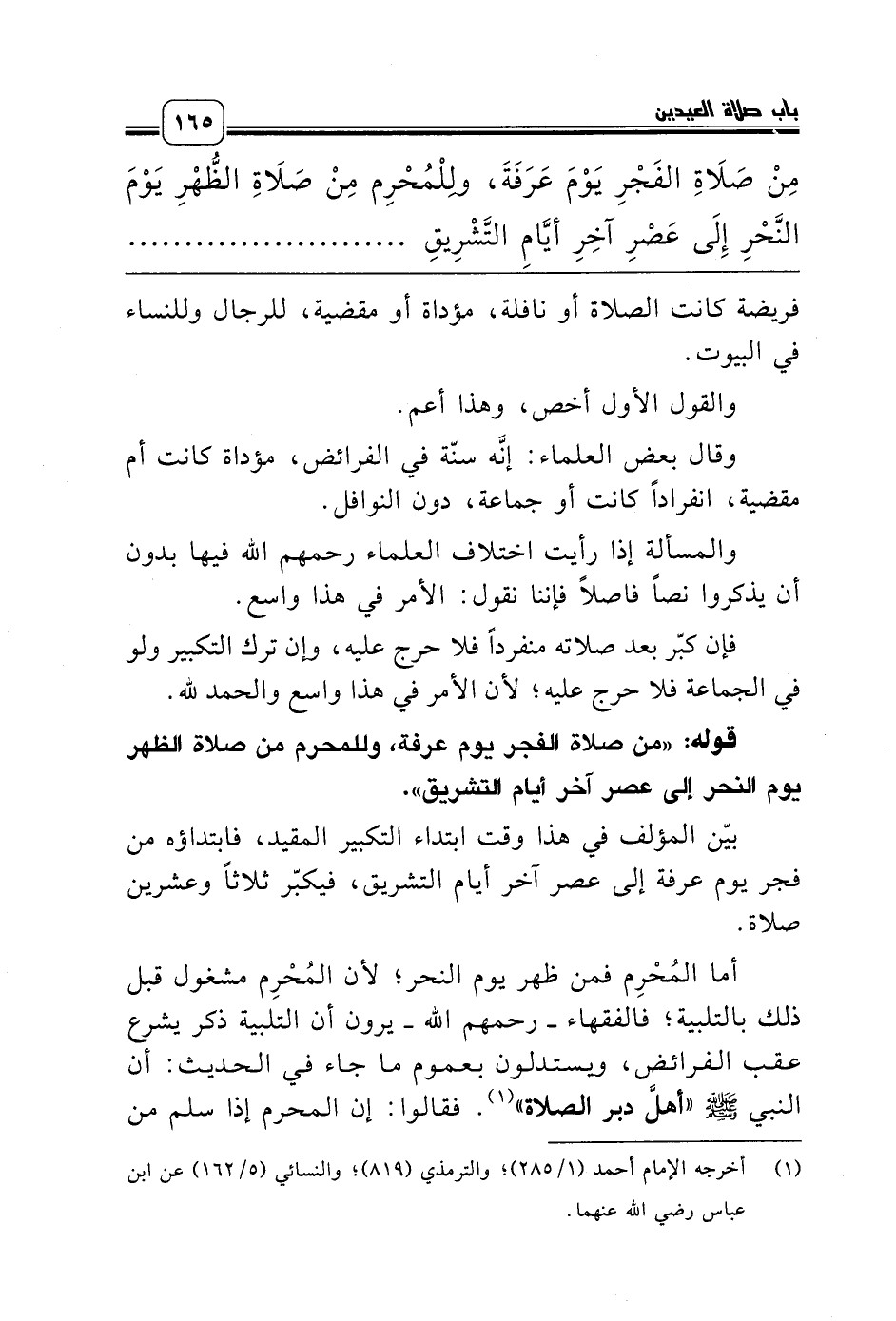 مِنْ صَلاَةِ الفَجْرِ يَوْمَ عَرَفَةَ، ولِلْمُحْرِم مِنْ صَلاَةِ الظُّهْرِ يَوْمَ النَّحْرِ إِلَى عَصْرِ آخِرِ أيَّامِ التَّشْرِيقِ .............