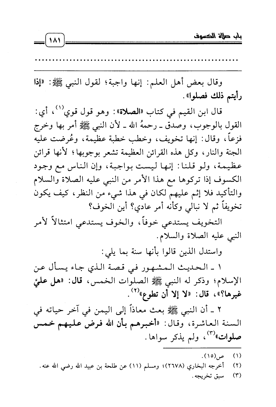 قال ابن القيم في كتاب «الصلاة»: وهو قول قوي (¬1)، أي: القول بالوجوب، وصدق ـ رحمه الله ـ لأن النبي صلّى الله عليه وسلّم أمر بها وخرج فزعاً، وقال: إنها تخويف، وخطب خطبة عظيمة، وعُرضت عليه الجنة والنار، وكل هذه القرائن العظيمة تشعر بوجوبها؛ لأنها قرائن عظيمة، ولو قلنا: إنها ليست بواجبة، وإن الناس مع وجود الكسوف إذا تركوها مع هذا الأمر من النبي عليه الصلاة والسلام والتأكيد فلا إثم عليهم لكان في هذا شيء من النظر، كيف يكون تخويفاً ثم لا نبالي وكأنه أمر عادي؟ أين الخوف؟