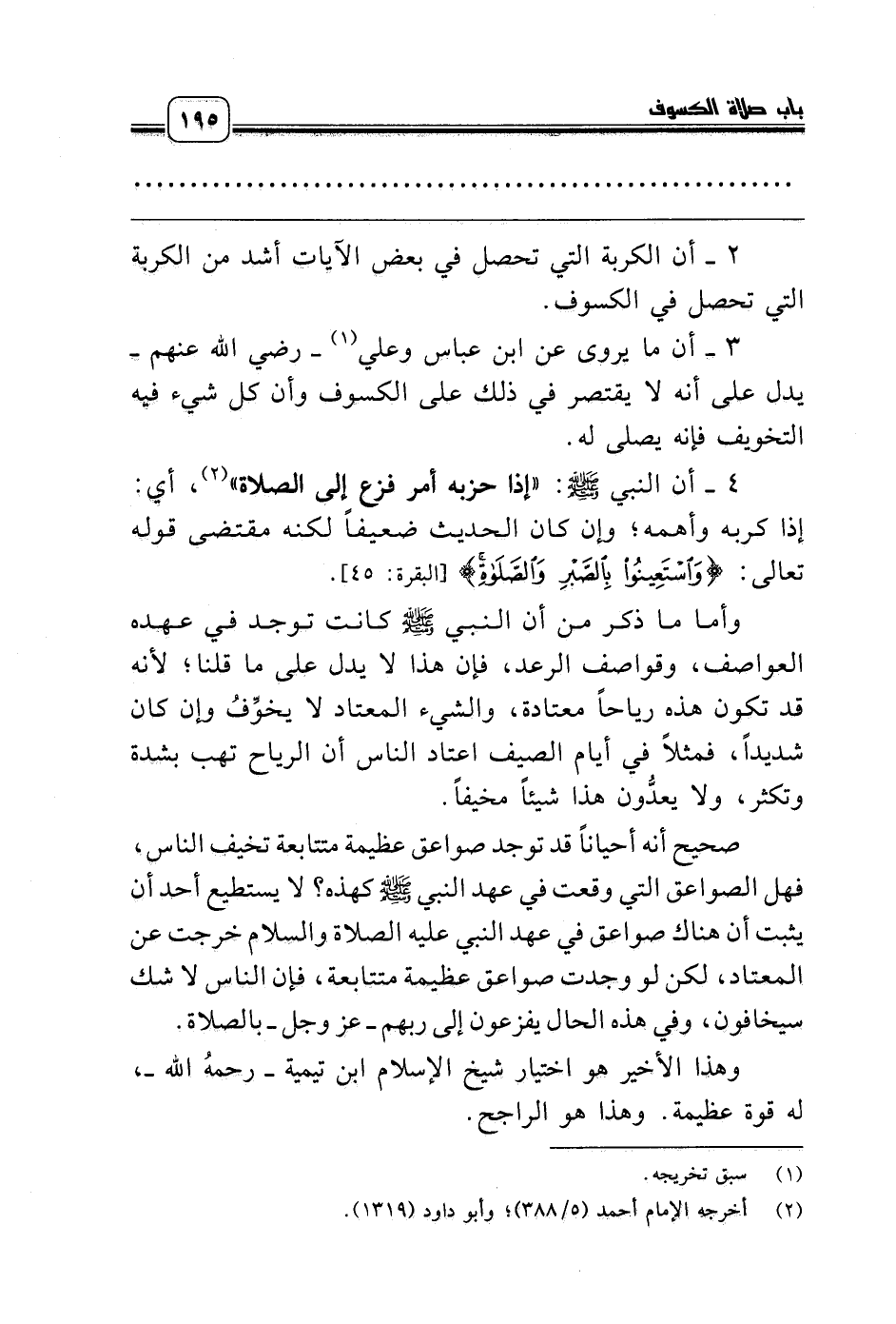 4 ـ أن النبي صلّى الله عليه وسلّم: «إذا حزبه أمر فزع إلى الصلاة» (¬2)، أي: إذا كربه وأهمه؛ وإن كان الحديث ضعيفاً لكنه مقتضى قوله تعالى: {وَاسْتَعِينُوا بِالصَّبْرِ وَالصَّلاَةِ} [البقرة: 45].