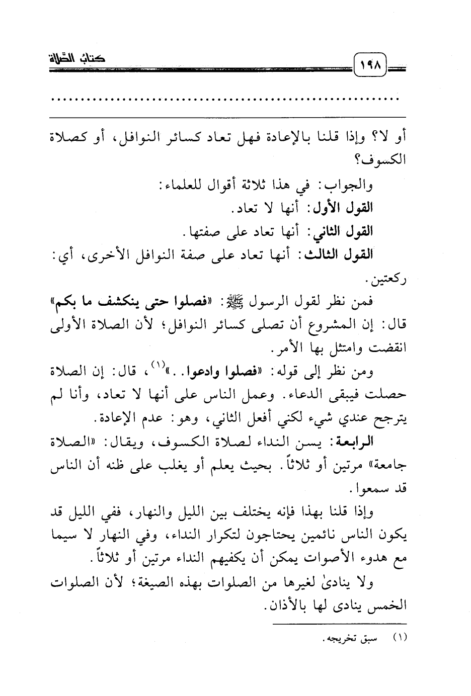 الرابعة: يسن النداء لصلاة الكسوف، ويقال: «الصلاة جامعة» مرتين أو ثلاثاً. بحيث يعلم أو يغلب على ظنه أن الناس قد سمعوا.
