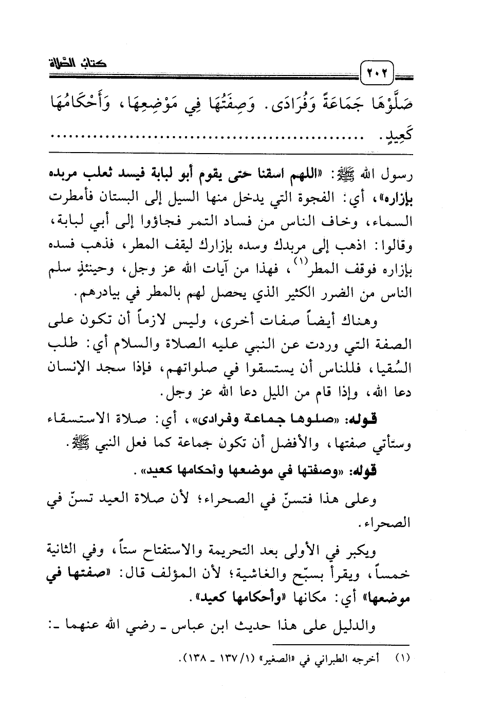 قوله: «صلوها جماعة وفرادى»، أي: صلاة الاستسقاء وستأتي صفتها، والأفضل أن تكون جماعة كما فعل النبي صلّى الله عليه وسلّم. قوله: «وصفتها في موضعها وأحكامها كعيد».