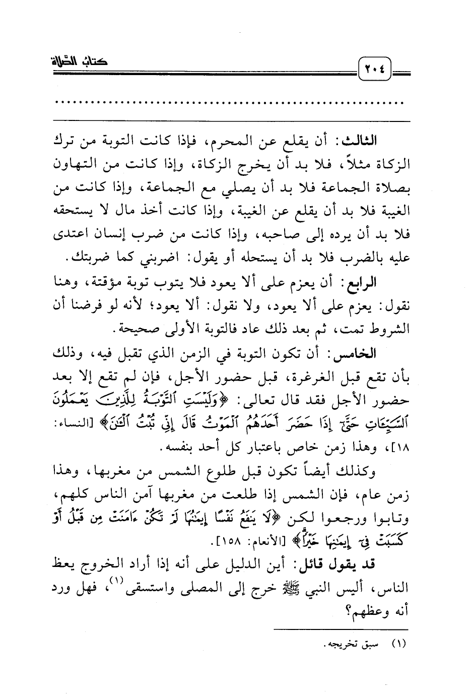 الخامس: أن تكون التوبة في الزمن الذي تقبل فيه، وذلك بأن تقع قبل الغرغرة، قبل حضور الأجل، فإن لم تقع إلا بعد حضور الأجل فقد قال تعالى: {وَلَيْسَتِ التَّوْبَةُ لِلَّذِينَ يَعْمَلُونَ السَّيِّئَاتِ حَتَّى إِذَا حَضَرَ أَحَدَهُمُ الْمَوْتُ قَالَ إِنِّي تُبْتُ الآنَ} [النساء: 18]، وهذا زمن خاص باعتبار كل أحد بنفسه.