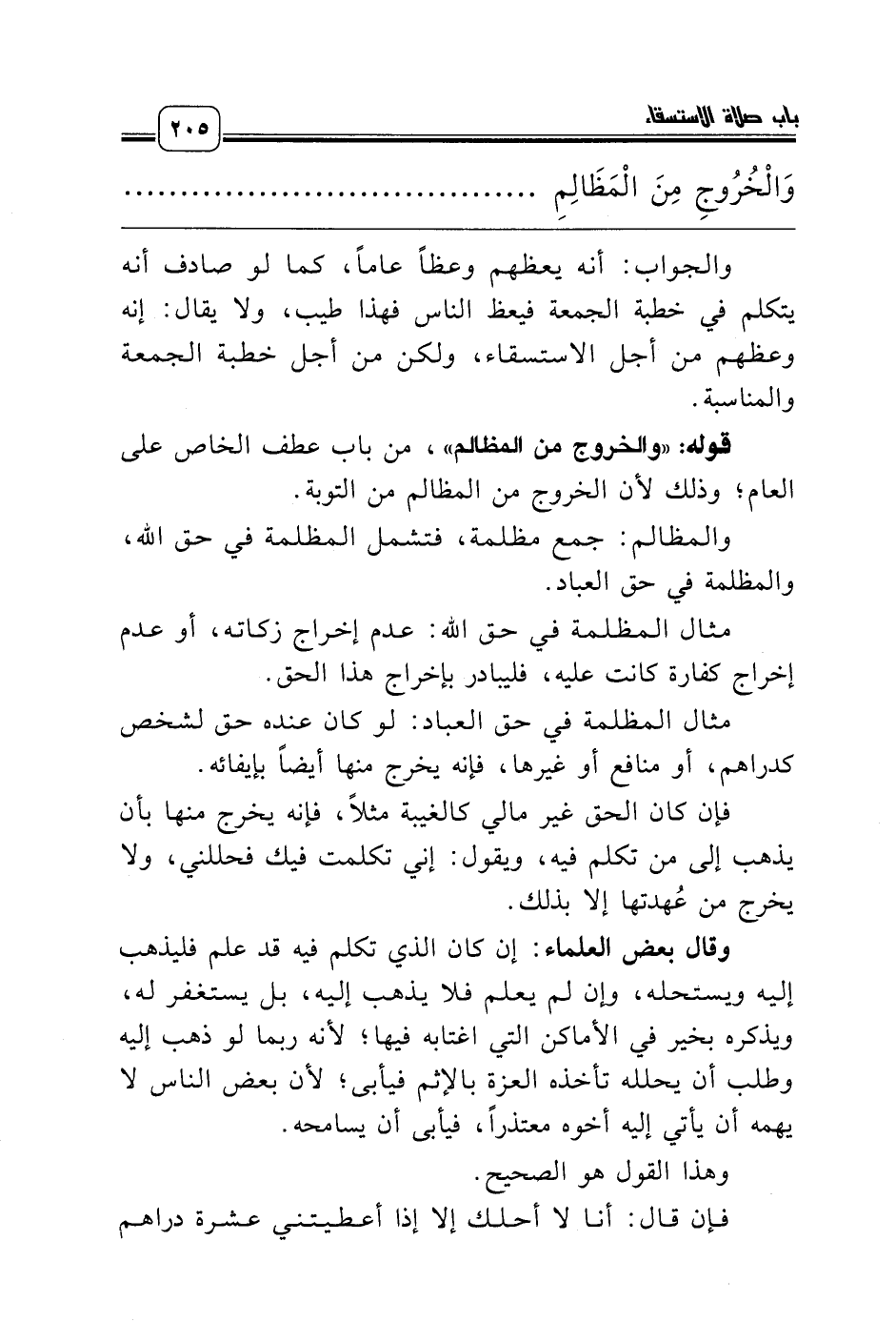 مثال المظلمة في حق العباد: لو كان عنده حق لشخص كدراهم، أو منافع أو غيرها، فإنه يخرج منها أيضاً بإيفائه.