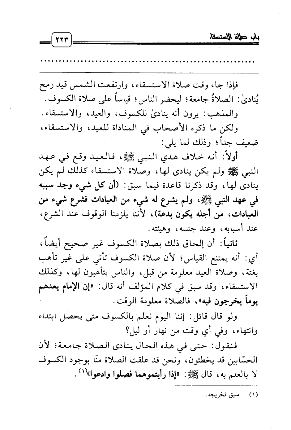 ثانياً: أن إلحاق ذلك بصلاة الكسوف غير صحيح أيضاً، أي: أنه يمتنع القياس؛ لأن صلاة الكسوف تأتي على غير تأهب بغتة، وصلاة العيد معلومة من قبل، والناس يتأهبون لها، وكذلك الاستسقاء، وقد سبق في كلام المؤلف أنه قال: «إن الإمام يعدهم يوماً يخرجون فيه»، فالصلاة معلومة الوقت.