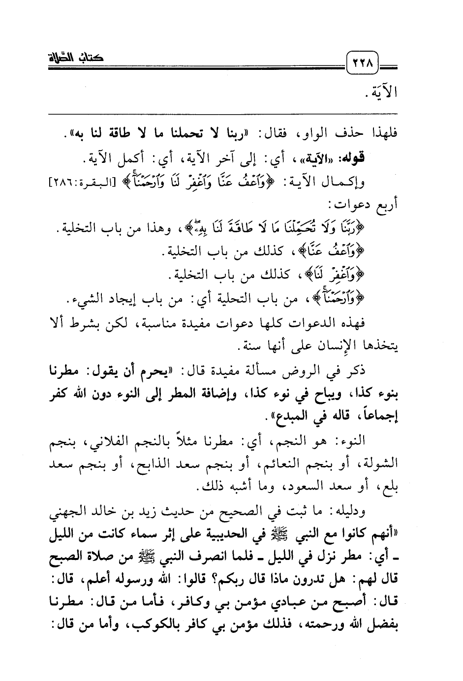 ودليله: ما ثبت في الصحيح من حديث زيد بن خالد الجهني «أنهم كانوا مع النبي صلّى الله عليه وسلّم في الحديبية على إثر سماء كانت من الليل ـ أي: مطر نزل في الليل ـ فلما انصرف النبي صلّى الله عليه وسلّم من صلاة الصبح قال لهم: هل تدرون ماذا قال ربكم؟ قالوا: الله ورسوله أعلم، قال: قال: أصبح من عبادي مؤمن بي وكافر، فأما من قال: مطرنا بفضل الله ورحمته، فذلك مؤمن بي كافر بالكوكب، وأما من قال: