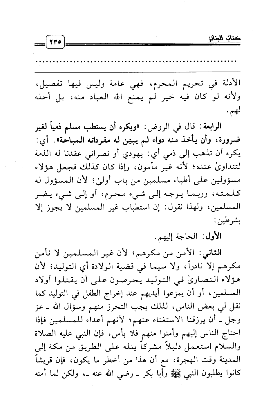 الرابعة: قال في الروض: «ويكره أن يستطب مسلم ذمياً لغير ضرورة، وأن يأخذ منه دواء لم يبيّن له مفرداته المباحة». أي: يكره أن تذهب إلى ذمي أي: يهودي أو نصراني عقدنا له الذمة لتتداوى عنده؛ لأنه غير مأمون، وإذا كان كذلك فجعل هؤلاء مسؤولين على أطباء مسلمين من باب أولى؛ لأن المسؤول له كلمته، وربما يوجه إلى شيء محرم، أو إلى شيء يضر المسلمين، ولهذا نقول: إن استطباب غير المسلمين لا يجوز إلا بشرطين:
