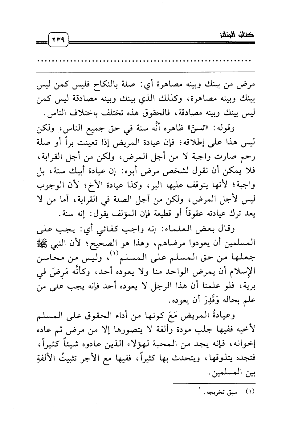 وقال بعض العلماء: إنه واجب كفائي أي: يجب على المسلمين أن يعودوا مرضاهم، وهذا هو الصحيح؛ لأن النبي صلّى الله عليه وسلّم جعلها من حق المسلم على المسلم (¬1)، وليس من محاسن الإِسلام أن يمرض الواحد منا ولا يعوده أحد، وكأنَّه مَرِضَ في برية، فلو علمنا أن هذا الرجل لا يعوده أحد فإنه يجب على من علم بحاله وَقَدِرَ أن يعوده.