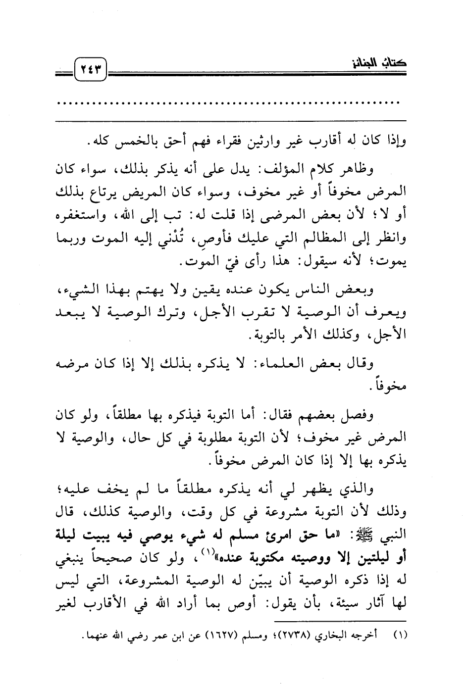 وبعض الناس يكون عنده يقين ولا يهتم بهذا الشيء، ويعرف أن الوصية لا تقرب الأجل، وترك الوصية لا يبعد الأجل، وكذلك الأمر بالتوبة.
