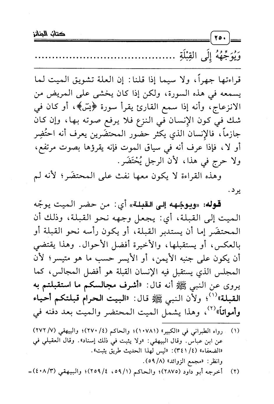 قوله: «ويوجّهه إلى القبلة» أي: من حضر الميت يوجّه الميت إلى القبلة، أي: يجعل وجهه نحو القبلة، وذلك أن المحتضَر إما أن يستدبر القبلة، أو يكون رأسه نحو القبلة أو بالعكس، أو يستقبلها، والأخيرة أفضل الأحوال. وهذا يقتضي أن يكون على جنبه الأيمن، أو الأيسر حسب ما هو متيسر؛ لأن المجلس الذي يستقبل فيه الإنسان القبلة هو أفضل المجالس، كما يروى عن النبي صلّى الله عليه وسلّم أنه قال: «أشرف مجالسكم ما استقبلتم به القبلة» (¬1)؛ ولأن النبي صلّى الله عليه وسلّم قال: «البيت الحرام قبلتكم أحياء وأمواتاً» (¬2)، وهذا يشمل الميت المحتضر والميت بعد دفنه في
