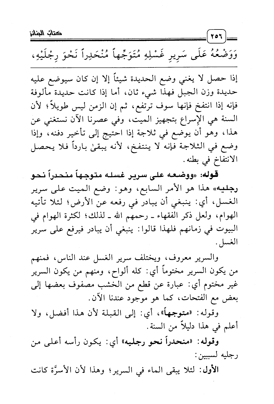 قوله: «ووضعه على سرير غسله متوجهاً منحدراً نحو رجليه» هذا هو الأمر السابع، وهو: وضع الميت على سرير الغسل، أي: ينبغي أن يبادر في رفعه عن الأرض؛ لئلا تأتيه الهوام، ولعل ذكر الفقهاء ـ رحمهم الله ـ لذلك؛ لكثرة الهوام في البيوت في زمانهم فلهذا قالوا: ينبغي أن يبادر فيرفع على سرير الغسل.