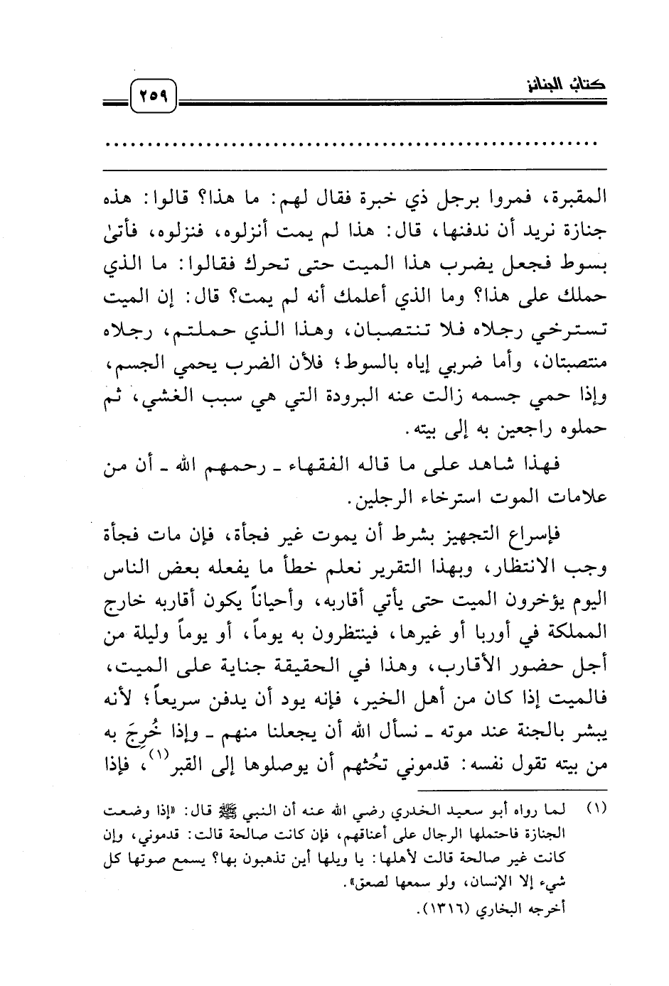 فإسراع التجهيز بشرط أن يموت غير فجأة، فإن مات فجأة وجب الانتظار، وبهذا التقرير نعلم خطأ ما يفعله بعض الناس اليوم يؤخرون الميت حتى يأتي أقاربه، وأحياناً يكون أقاربه خارج المملكة في أوربا أو غيرها، فينتظرون به يوماً، أو يوماً وليلة من أجل حضور الأقارب، وهذا في الحقيقة جناية على الميت، فالميت إذا كان من أهل الخير، فإنه يود أن يدفن سريعاً؛ لأنه يبشر بالجنة عند موته ـ نسأل الله أن يجعلنا منهم ـ وإذا خُرِجَ به من بيته تقول نفسه: قدموني تحُثهم أن يوصلوها إلى القبر (¬1)، فإذا