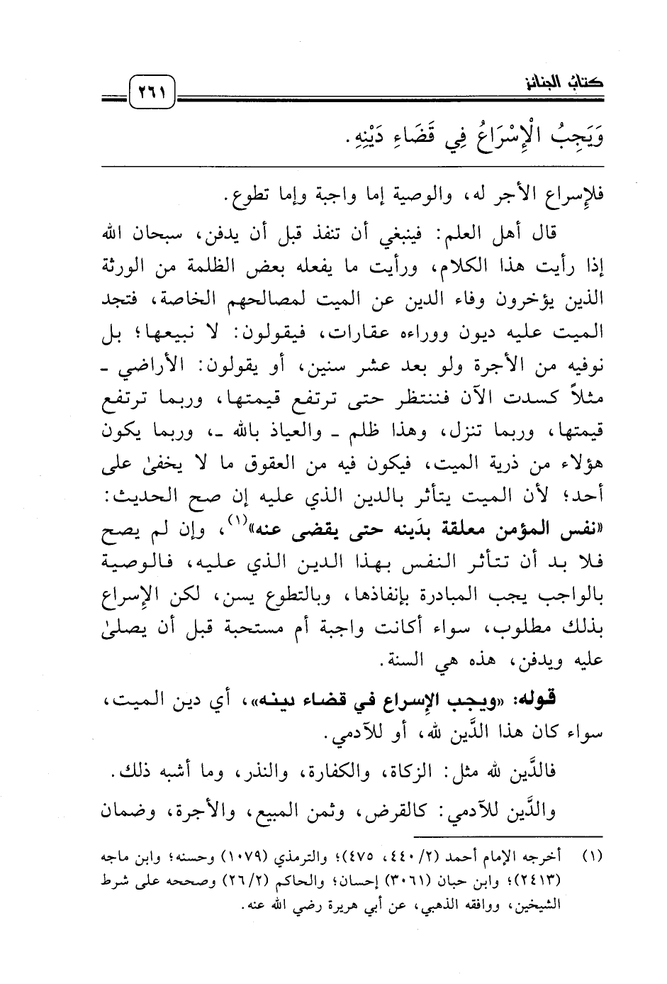 قوله: «ويجب الإِسراع في قضاء دينه»، أي دين الميت، سواء كان هذا الدَّين لله، أو للآدمي.