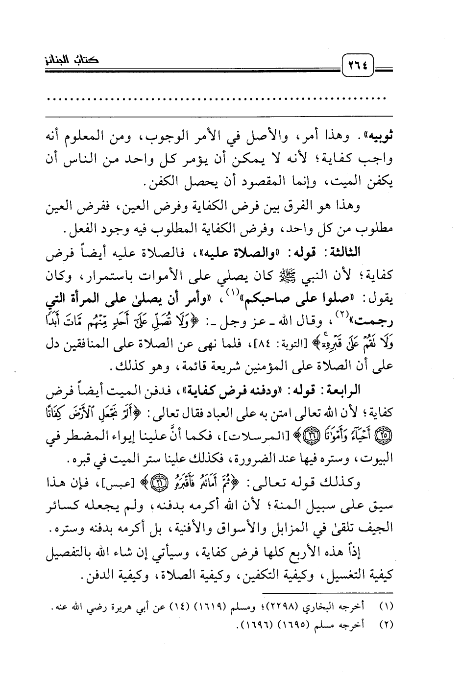 الثالثة: قوله: «والصلاة عليه»، فالصلاة عليه أيضاً فرض كفاية؛ لأن النبي صلّى الله عليه وسلّم كان يصلي على الأموات باستمرار، وكان يقول: «صلوا على صاحبكم» (¬1)، «وأمر أن يصلى على المرأة التي رجمت» (¬2)، وقال الله ـ عز وجل ـ: {وَلاَ تُصَلِّ عَلَى أَحَدٍ مِنْهُمْ مَاتَ أَبَدًا وَلاَ تَقُمْ عَلَى قَبْرِهِ} [التوبة: 84]، فلما نهى عن الصلاة على المنافقين دل على أن الصلاة على المؤمنين شريعة قائمة، وهو كذلك.