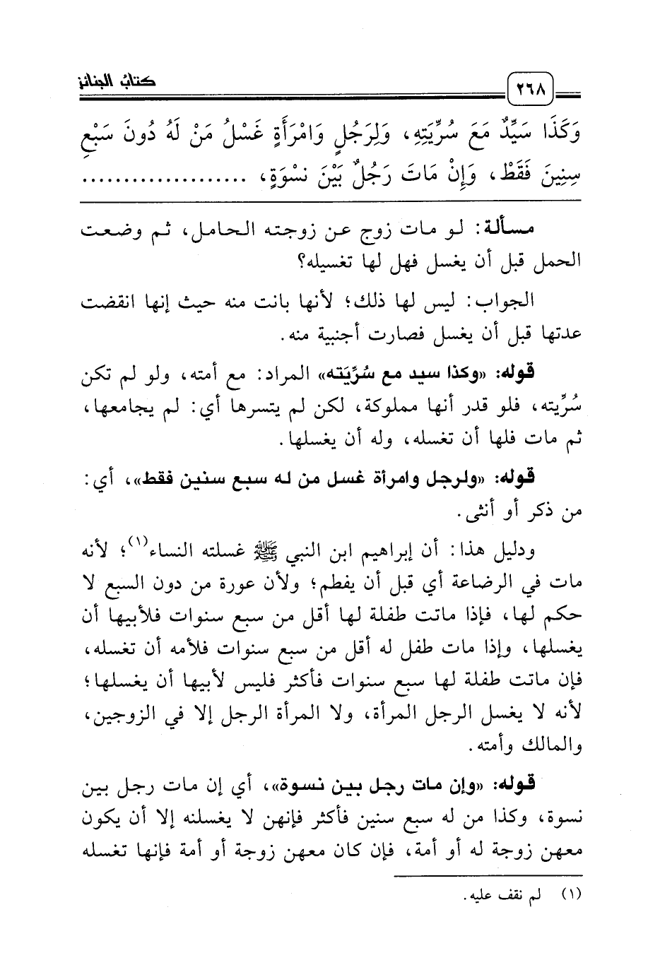 ودليل هذا: أن إبراهيم ابن النبي صلّى الله عليه وسلّم غسلته النساء (¬1)؛ لأنه مات في الرضاعة أي قبل أن يفطم؛ ولأن عورة من دون السبع لا حكم لها، فإذا ماتت طفلة لها أقل من سبع سنوات فلأبيها أن يغسلها، وإذا مات طفل له أقل من سبع سنوات فلأمه أن تغسله، فإن ماتت طفلة لها سبع سنوات فأكثر فليس لأبيها أن يغسلها؛ لأنه لا يغسل الرجل المرأة، ولا المرأة الرجل إلا في الزوجين، والمالك وأمته.