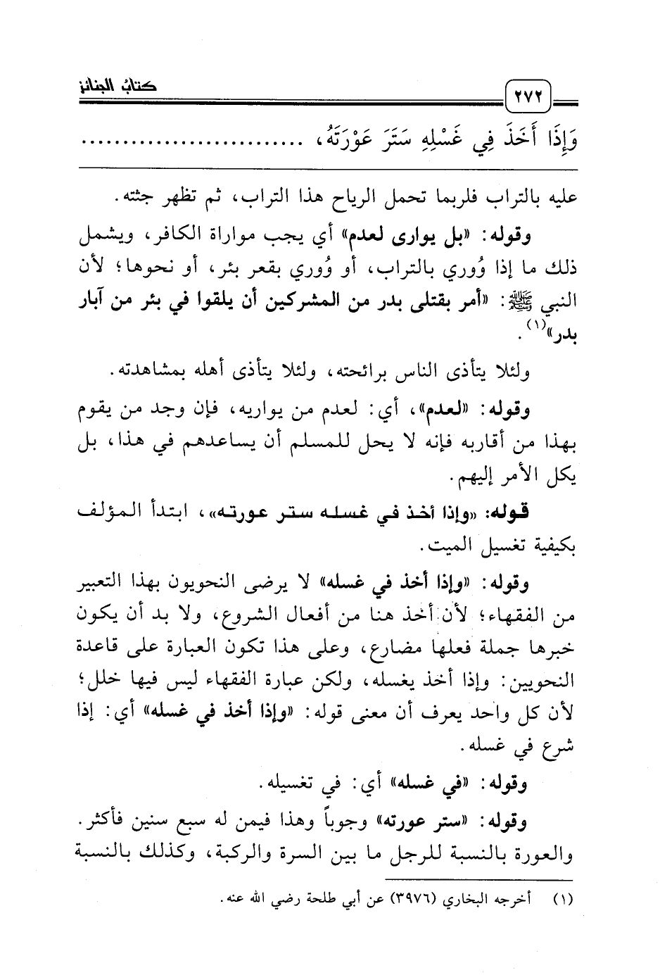 وقوله: «بل يوارى لعدم» أي يجب مواراة الكافر، ويشمل ذلك ما إذا وُوري بالتراب، أو وُوري بقعر بئر، أو نحوها؛ لأن النبي صلّى الله عليه وسلّم: «أمر بقتلى بدر من المشركين أن يلقوا في بئر من آبار بدر» (¬1).