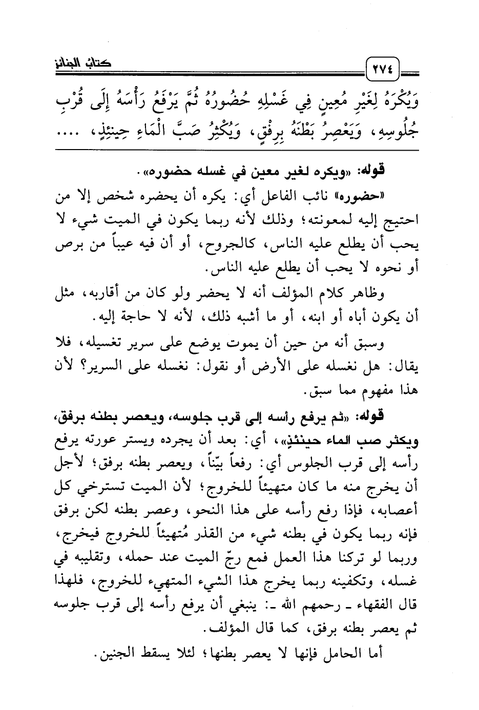 وَيُكْرَهُ لِغَيْرِ مُعِينٍ فِي غَسْلِهِ حُضُورُهُ ثُمَّ يَرْفَعُ رَأْسَهُ إِلَى قُرْبِ جُلُوسِهِ، وَيَعْصِرُ بَطْنَهُ بِرِفْقٍ، وَيُكْثِرُ صَبَّ الْمَاءِ حِينئِذٍ، ............