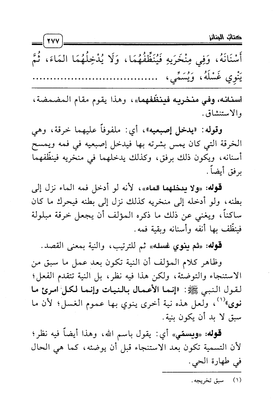 قوله: «ويسمّي» أي: يقول باسم الله، وهذا أيضاً فيه نظر؛ لأن التسمية تكون بعد الاستنجاء قبل أن يوضئه، كما هي الحال في طهارة الحي.