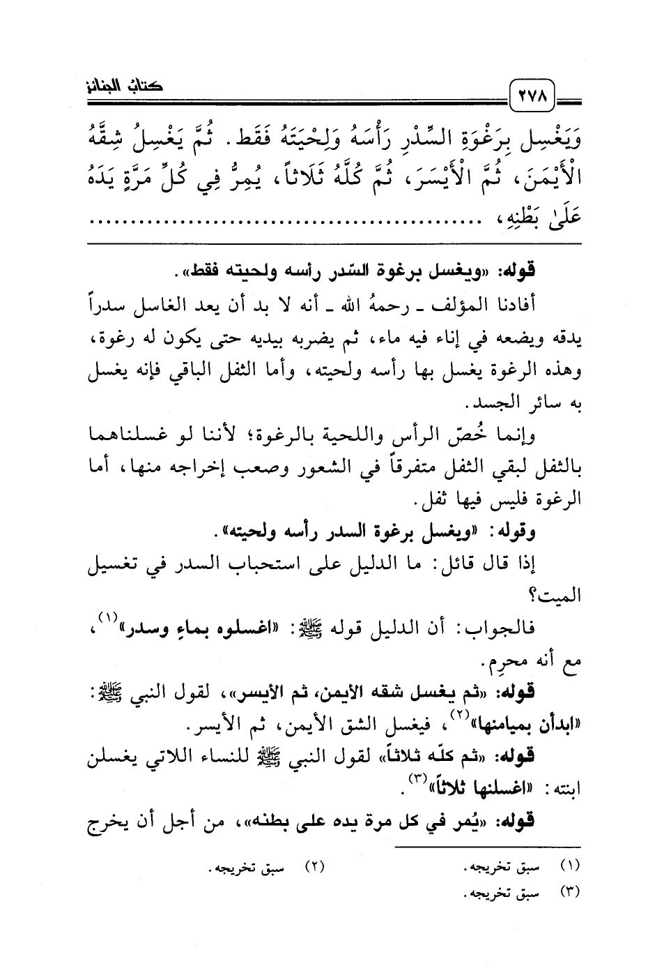 وَيَغْسِل بِرَغْوَةِ السِّدْرِ رَأْسَهُ وَلِحْيَتَهُ فَقَط. ثُمَّ يَغْسِلُ شِقَّهُ الأَْيْمَنَ، ثُمَّ الأَْيْسَرَ، ثُمَّ كُلَّهُ ثَلاَثاً، يُمِرُّ فِي كُلِّ مَرَّةٍ يَدَهُ عَلَى بَطْنِهِ، فَإِنْ لَمْ يَنْقَ بِثَلاَثٍ زِيدَ حَتَّى يَنْقَى ..........