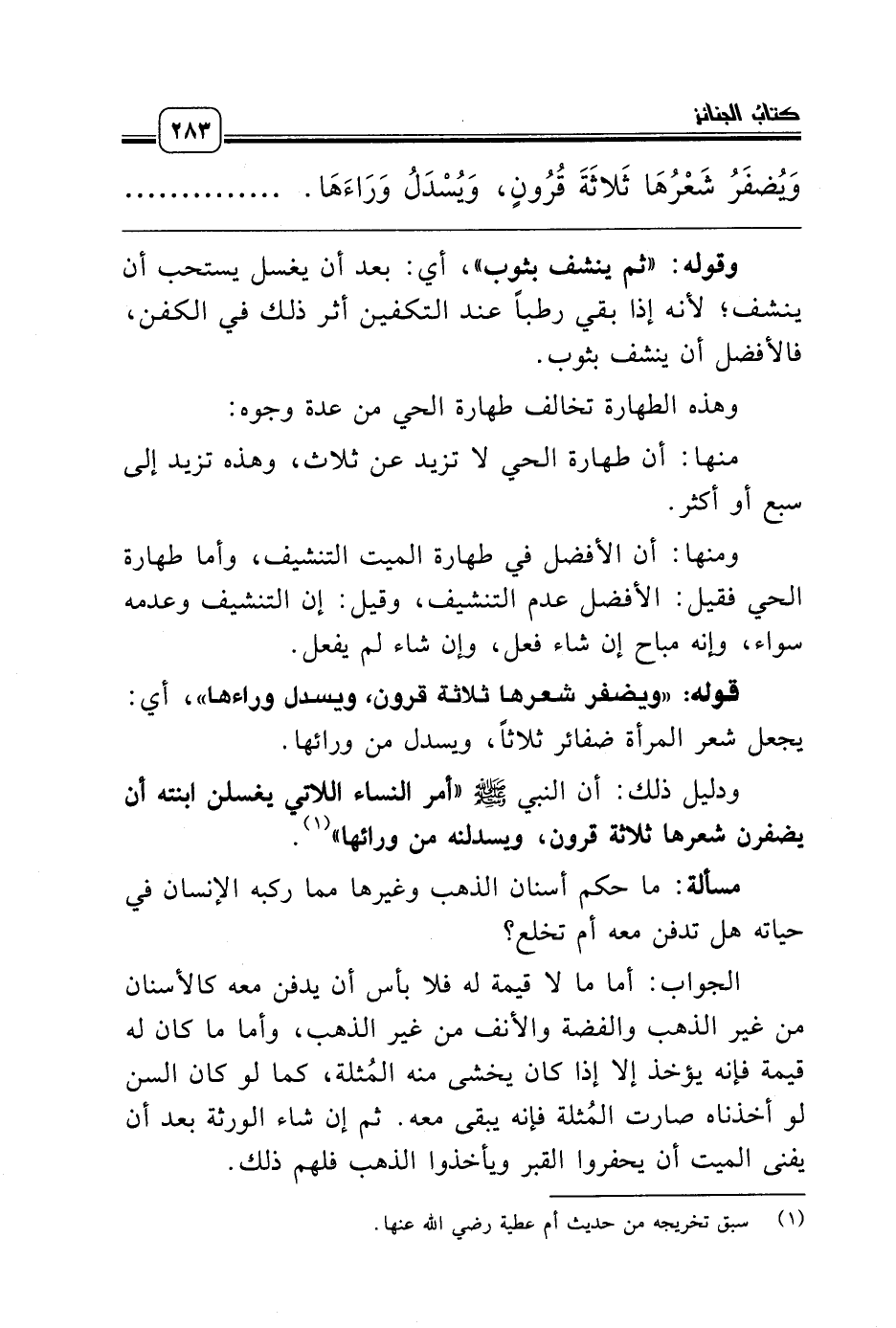 ودليل ذلك: أن النبي صلّى الله عليه وسلّم «أمر النساء اللاتي يغسلن ابنته أن يضفرن شعرها ثلاثة قرون، ويسدلنه من ورائها» (¬1).
