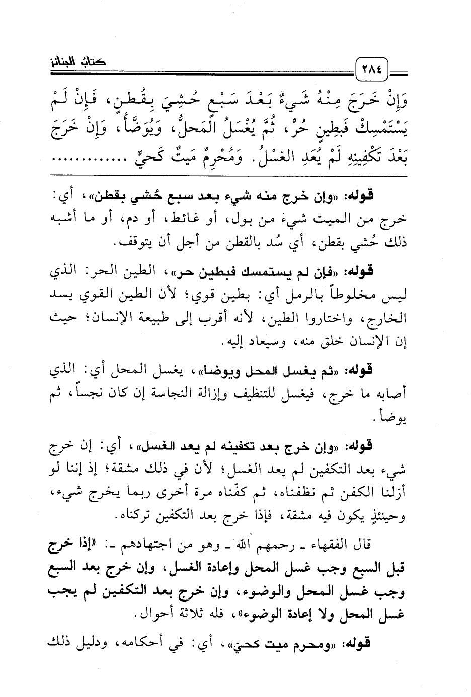 وَإِنْ خَرَجَ مِنْهُ شَيءٌ بَعْدَ سَبْعٍ حُشِيَ بِقُطنٍ، فَإِنْ لَمْ يَسْتَمْسِكْ فَبطِينٍ حُرٍّ، ثُمَّ يُغْسَلُ المَحلُّ، وَيُوَضَّأُ، وَإِنْ خَرَجَ بَعْدَ تَكْفِينِهِ لَمْ يُعَدِ الغسْلُ. وَمُحْرِمٌ مَيتٌ كَحيٍّ ...........