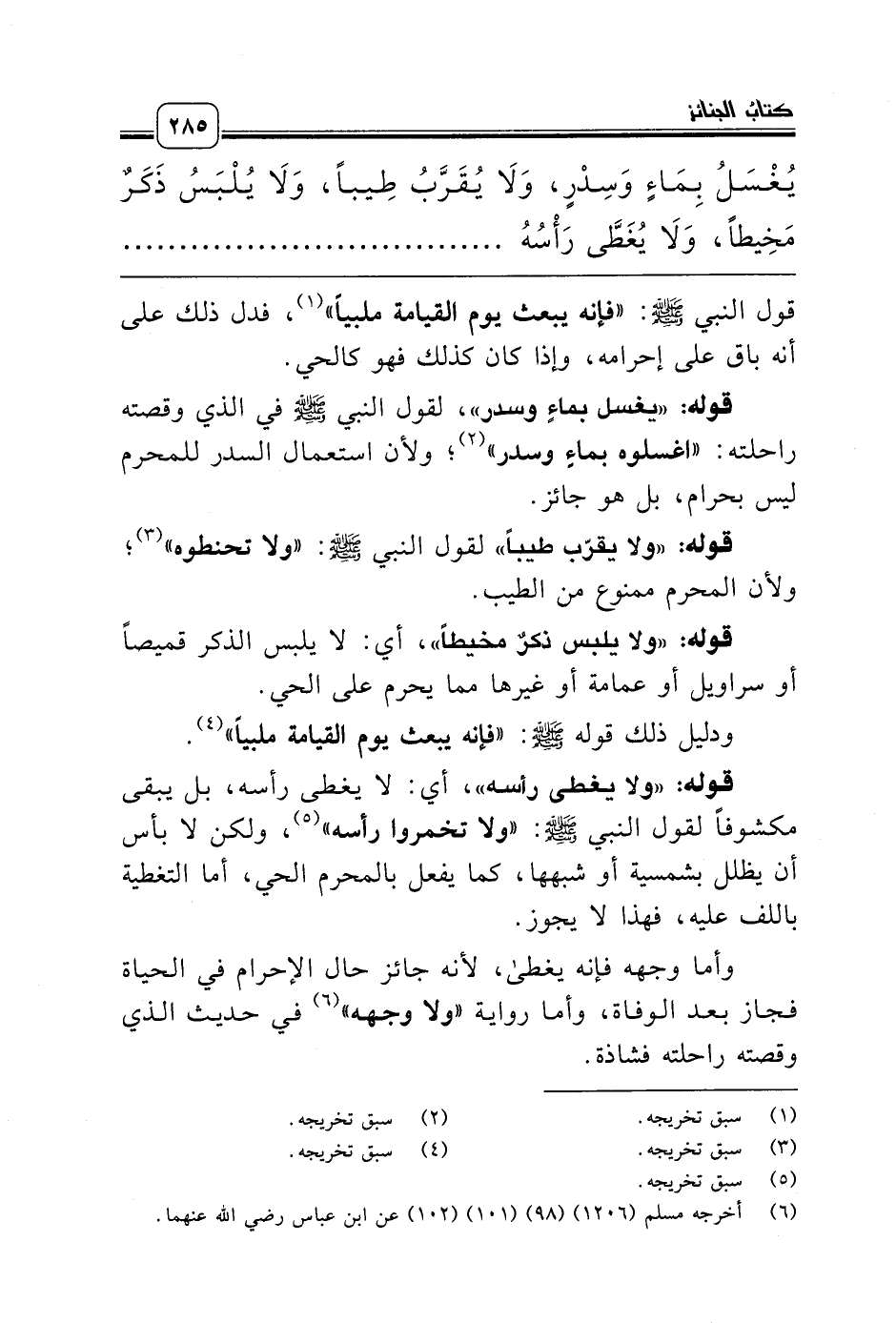 يُغْسَلُ بِمَاءٍ وَسِدْرٍ، وَلاَ يُقَرَّبُ طِيباً، وَلاَ يُلْبَسُ ذَكَرٌ مَخِيطاً، وَلاَ يُغَطَّى رَأْسُهُ .......