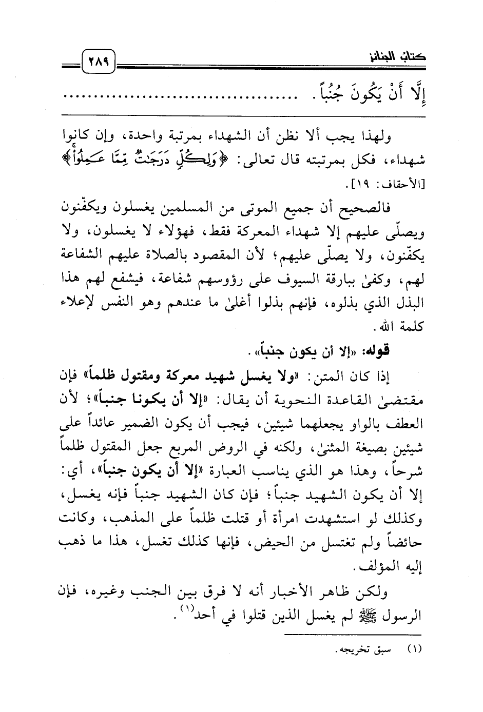 إذا كان المتن: «ولا يغسل شهيد معركة ومقتول ظلماً» فإن مقتضى القاعدة النحوية أن يقال: «إلا أن يكونا جنباً»؛ لأن العطف بالواو يجعلهما شيئين، فيجب أن يكون الضمير عائداً على شيئين بصيغة المثنى، ولكنه في الروض المربع جعل المقتول ظلماً شرحاً، وهذا هو الذي يناسب العبارة «إلا أن يكون جنباً»، أي: إلا أن يكون الشهيد جنباً؛ فإن كان الشهيد جنباً فإنه يغسل، وكذلك لو استشهدت امرأة أو قتلت ظلماً على المذهب، وكانت حائضاً ولم تغتسل من الحيض، فإنها كذلك تغسل، هذا ما ذهب إليه المؤلف.