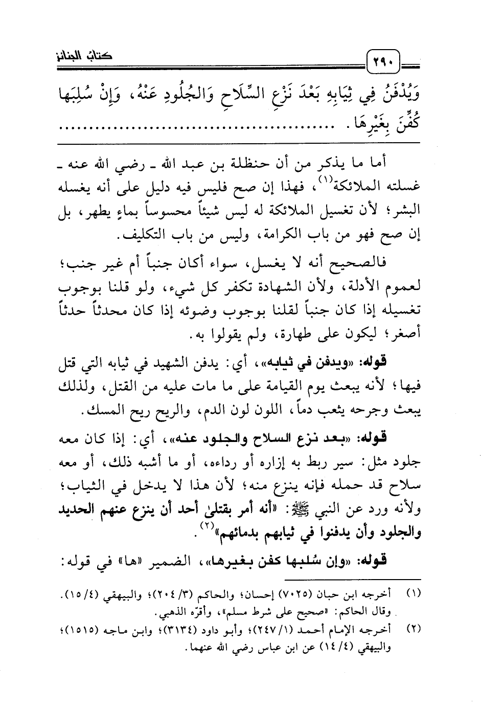 قوله: «بعد نزع السلاح والجلود عنه»، أي: إذا كان معه جلود مثل: سير ربط به إزاره أو رداءه، أو ما أشبه ذلك، أو معه سلاح قد حمله فإنه ينزع منه؛ لأن هذا لا يدخل في الثياب؛ ولأنه ورد عن النبي صلّى الله عليه وسلّم: «أنه أمر بقتلى أحد أن ينزع عنهم الحديد والجلود وأن يدفنوا في ثيابهم بدمائهم» (¬2).