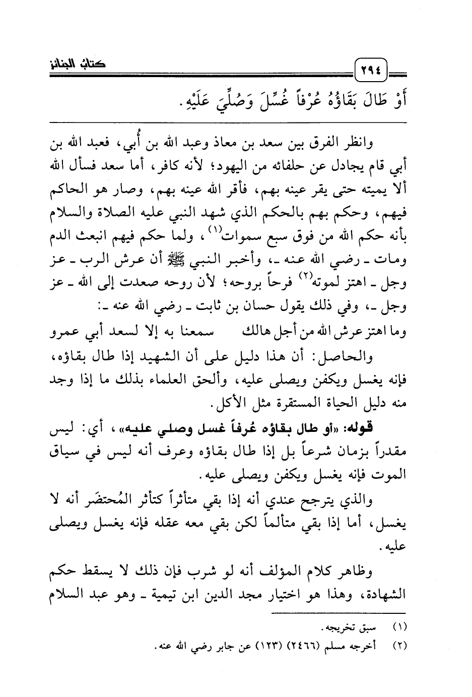 والحاصل: أن هذا دليل على أن الشهيد إذا طال بقاؤه، فإنه يغسل ويكفن ويصلى عليه، وألحق العلماء بذلك ما إذا وجد منه دليل الحياة المستقرة مثل الأكل.